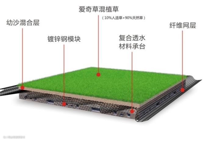 爱奇混植草以营养土做基底,将低密度的人造草与高密度的天然种草(混合配草种)混植,并进行培育,是一种新型的运动草坪解决方案,可以说是结合了人造草和天然草的优点,很接近天然草。