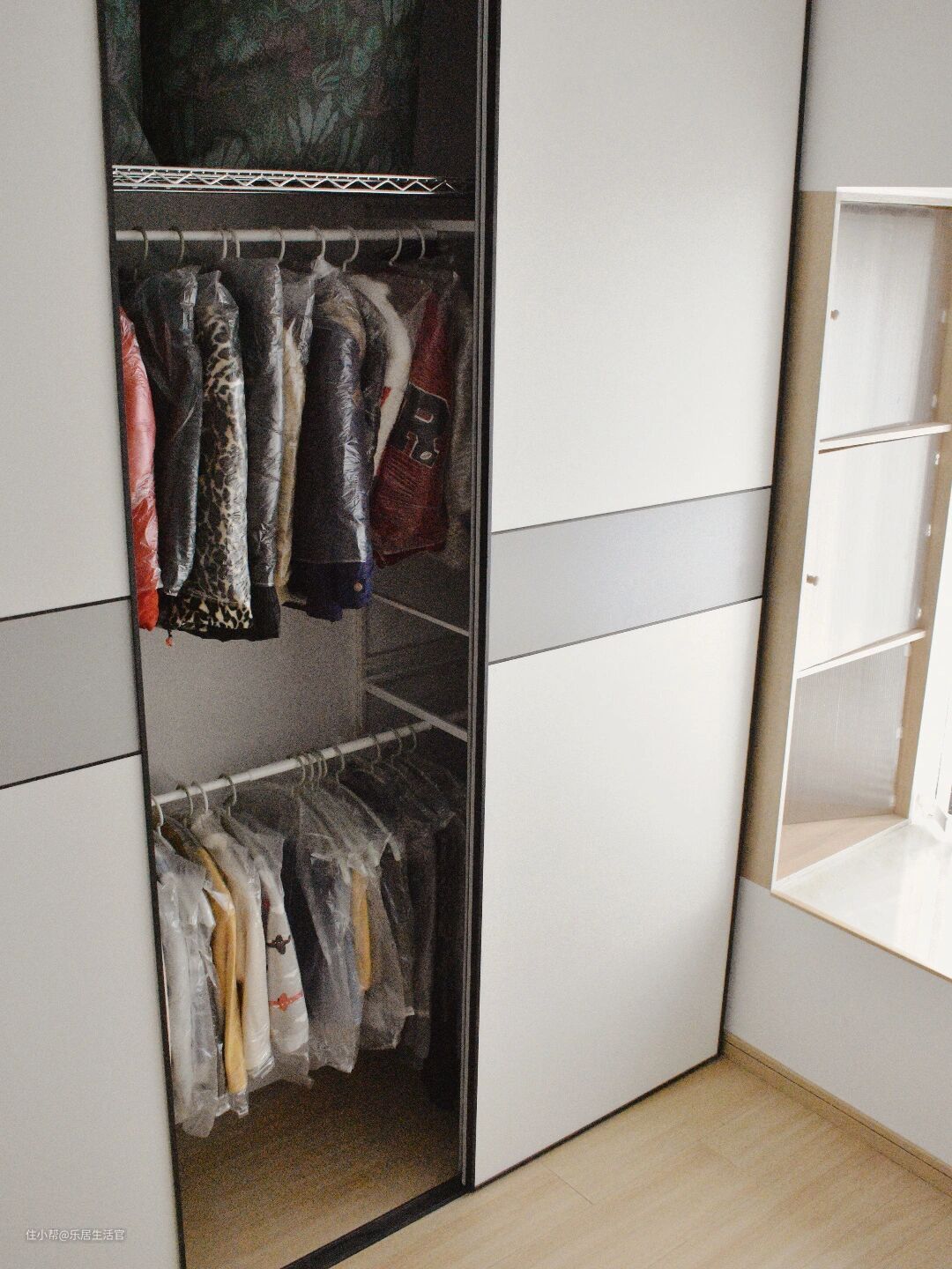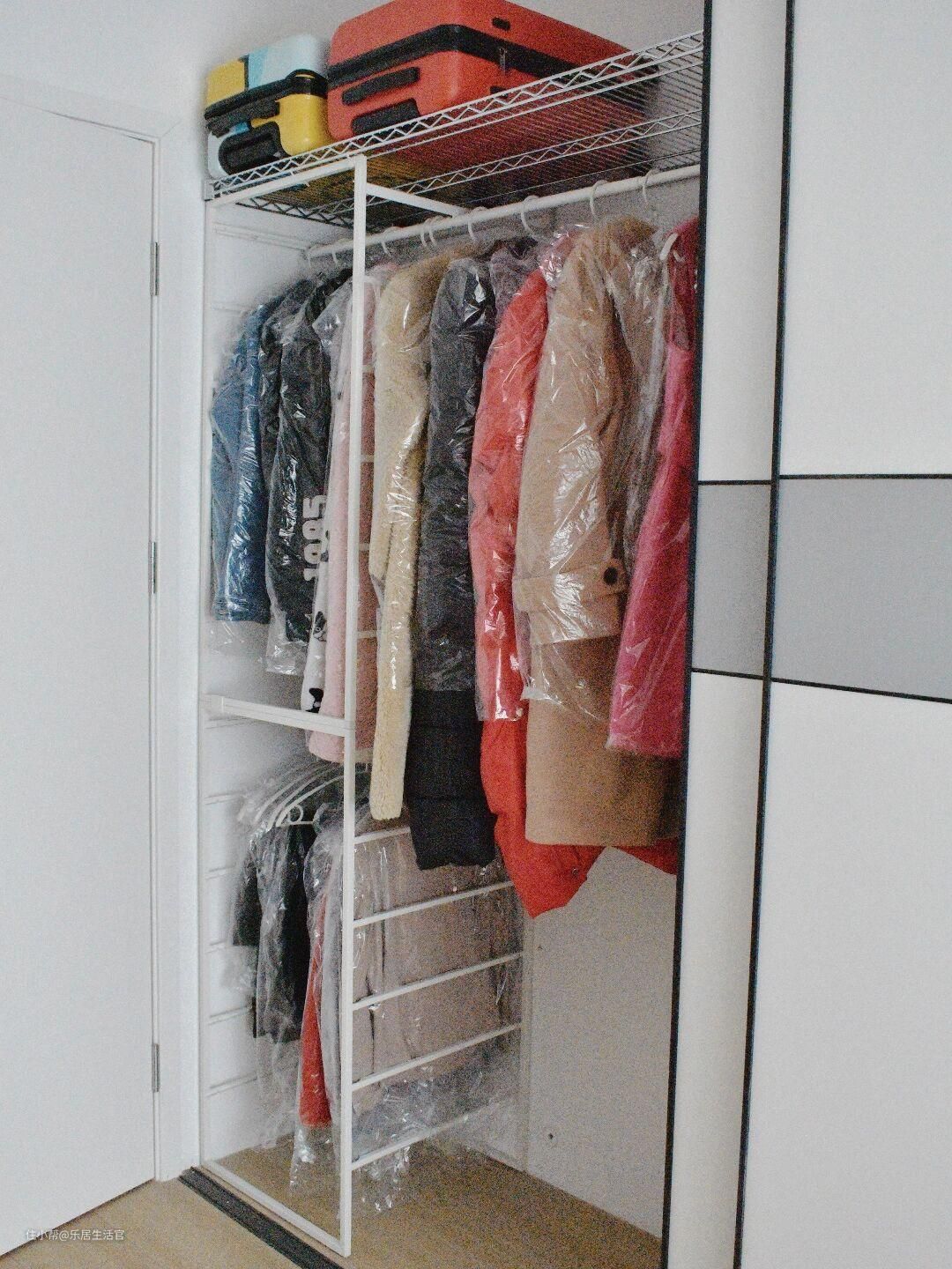 而且所有当季穿的衣服都可以挂起来,一个季度的放在一起不用再翻翻找找,特别方便,选择统一风格的衣架,显得更加美观。