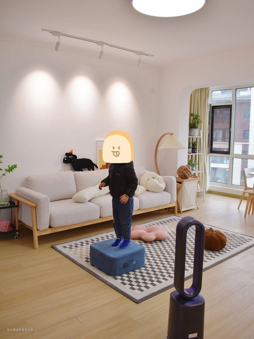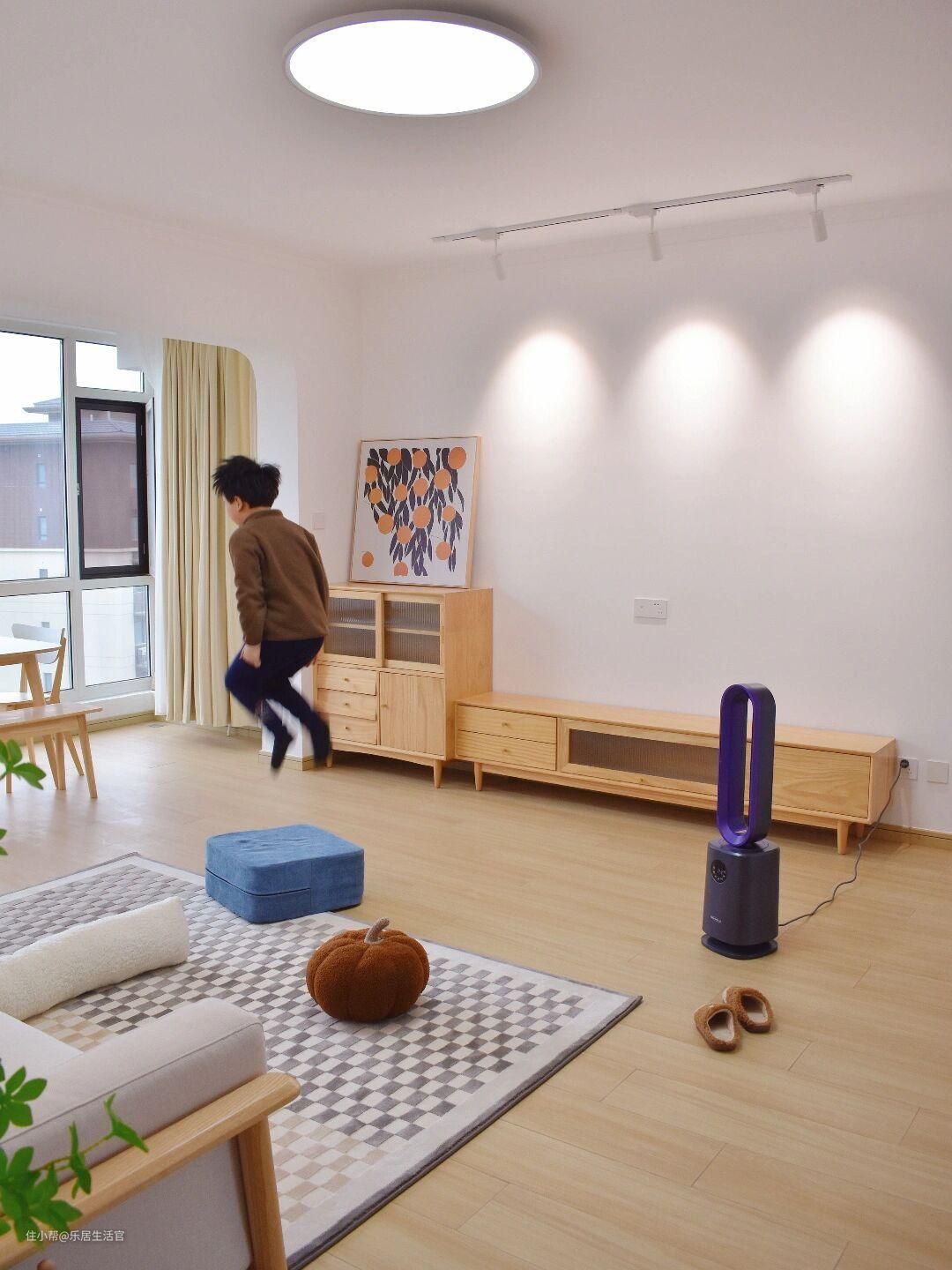 沙发也是非常简洁的三人位小沙发,但舒适感很强,奶白色的沙发套也很好看,还不用担心沙发被孩子弄脏。除了家具,电器的选择也考虑了小朋友,比如这款无叶风扇,没有扇叶,可以随意触摸,安全性能up!对于有小朋友和宠物的家庭来说,非常友好!