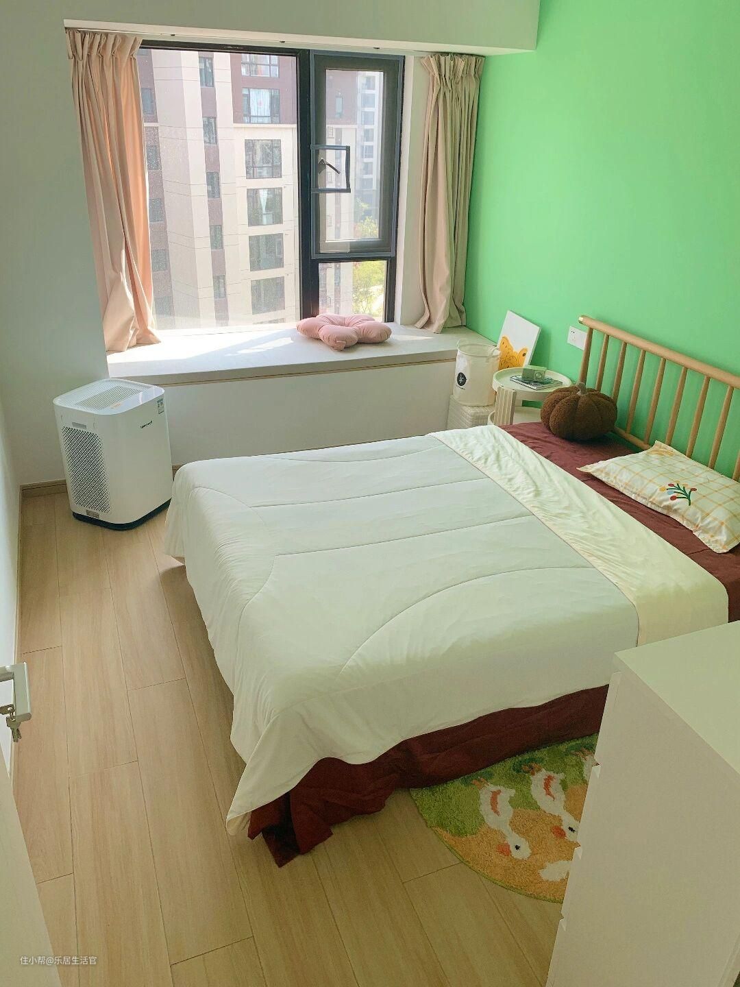 卧室的装修延续客厅的装修风格,不过墙面处理不同,每个卧室都选择不同颜色的墙漆。地面则是通铺的木纹砖,既有木纹地板的温馨感,又如同瓷砖一样好打理。