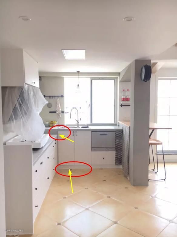 但有个细节问题估计很多人没有注意,就是踢脚线挡板的高度。如果你没有仔细看图纸的话,有些商家会在这里动点“小心机”,只是单纯地将支撑脚抬高,而不是真正的将橱柜地柜整体做高,表面上看没什么问题,实际上纯属“偷工减料”,而且踢脚线太高也不美观。