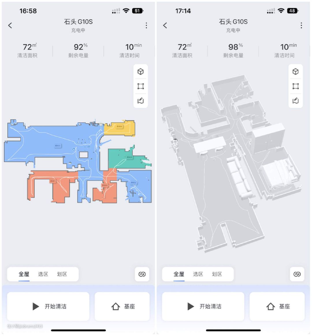 ▲石头G10s生成的地图最慢,地图边缘较为粗糙。2D平面地图把客厅和衣帽间连在了一起没有区分开。好在用户可以手动分割自定义。支持全屋、选区、划区3种清洁方案。