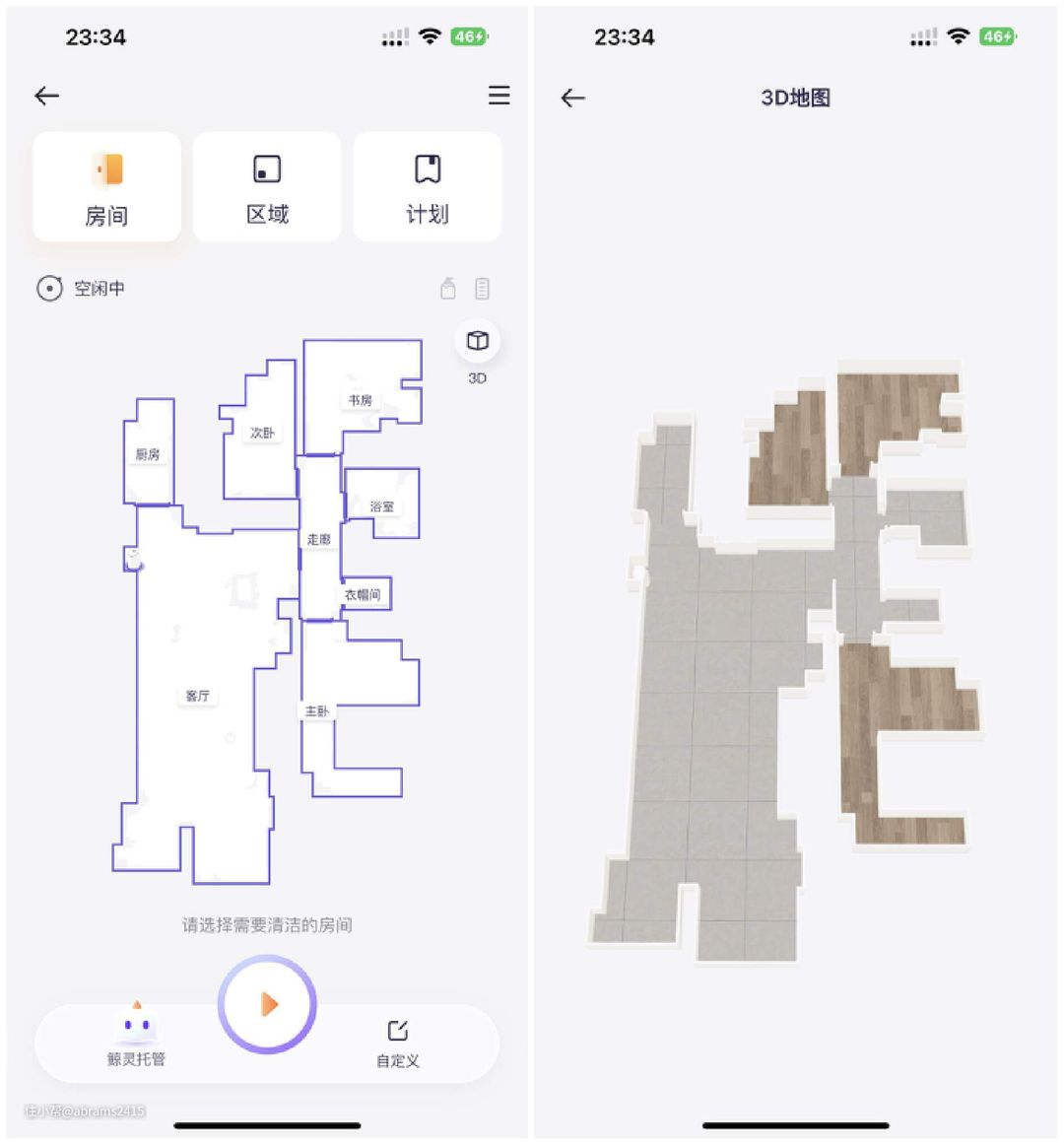 ▲云鲸J3生成的地图精度也很高,能自动识别出地砖和木地板。但刚更新的3D地图缺少摆放家具功能,所以基本没啥实际用处。支持房间、区域、计划、鲸灵托管、自定义5种清洁方案。