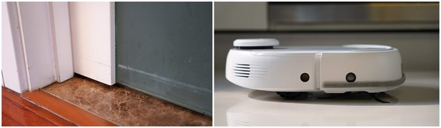 ▲如果家里地形复杂、或者新装修。那一定要慎入。上图是我首发入手J1半年后家里踢脚线、实木门差不多被它磕碰磨掉了一层。只能无奈给它贴上了防撞条。