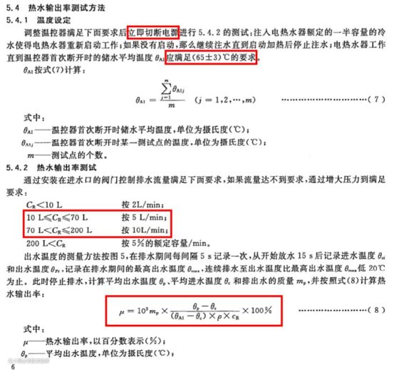 断电状态下,从65度左右开始按5L/min放水,一直到放出水低于初始温度20度时停止,计算放出热水比例与温度下降比例的乘积。