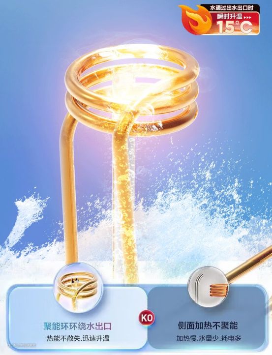 3D聚能环是在出水口做速热,让出水温度快速提升15度,如果进水温度是25度,那开启不用等,直接就能放出40度热水了,而且热水不限量。