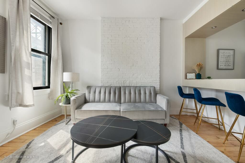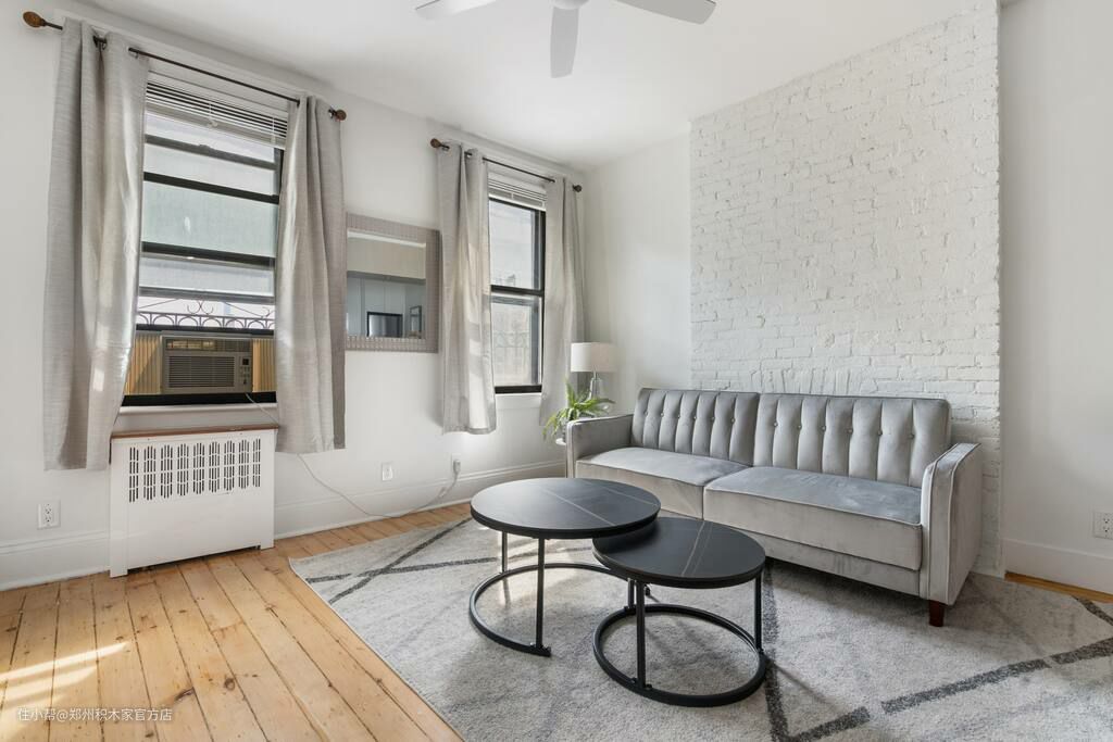 客厅的设计以白色为主,使用了简洁的白色墙面和家具,使得整个空间看起来非常明亮和宽敞。灰色沙发提供了一个舒适的休闲区域,搭配红色砖墙和乳胶漆墙面,为客厅增添了一份温馨和自然感。