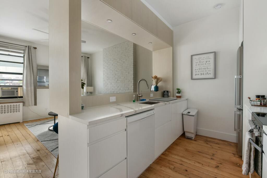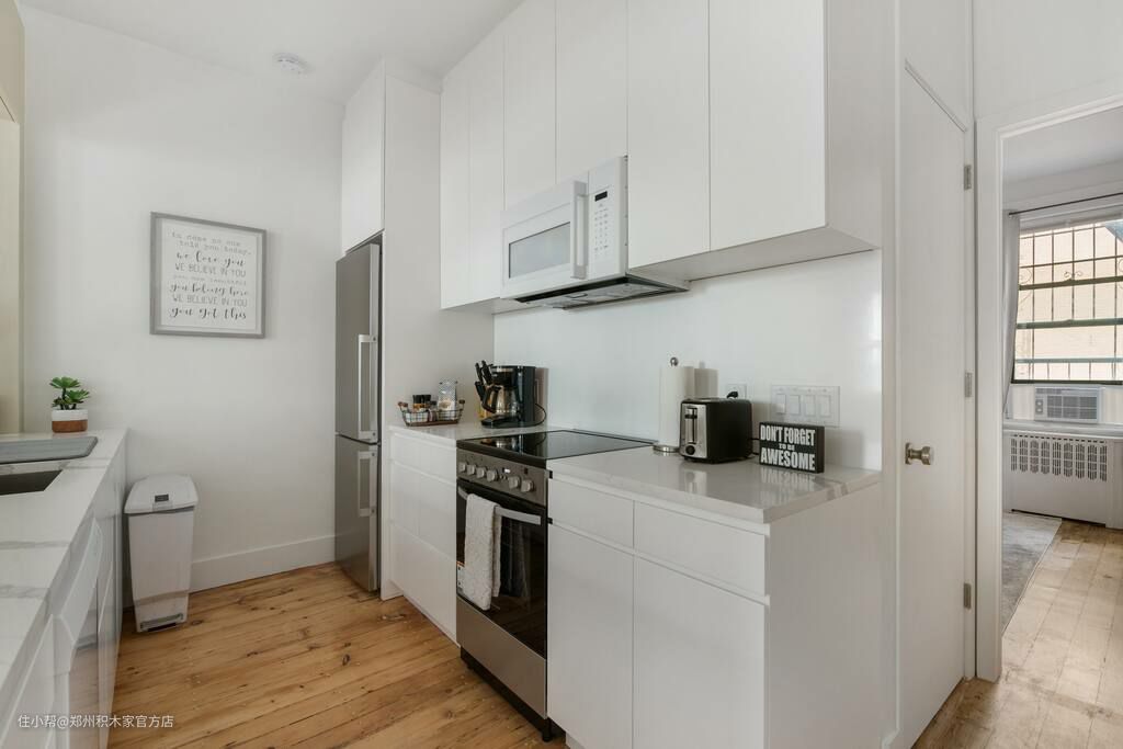 厨房内部空间虽然小巧,但是应有尽有,各种厨房设备、厨具和餐具都齐全。白色的墙面和橱柜为厨房提供了一个简单的背景,使得各种设备都更加显眼和重要。同时,厨房内部也使用了充足的照明,使得烹饪和就餐都更加舒适和方便。