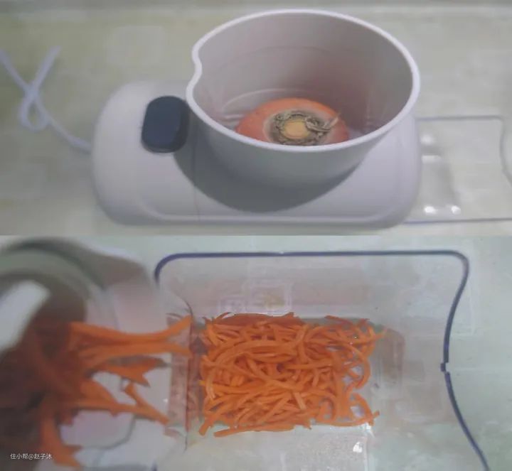 注意一点,那就是要及时压料棒将蔬菜缓慢压倒底,最大的感受就是切菜速度快,而且轻松,时间不到十几秒,一根萝卜就切完了。