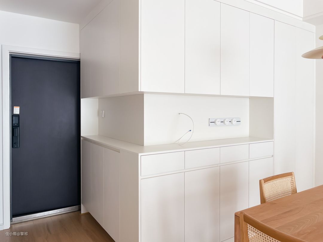 客餐厅形成一体化,宽敞通透,在不影响餐厅的使用时,视觉感受也还不错,不至于显得狭小紧凑。侧面是L型转角餐边柜,一门到顶无拉手设计真的yyds ,安装反弹器简约又耐看。。