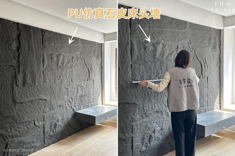 其实这是种新型材质,叫做PU仿真石皮,之所以选择将它铺贴于床头,主要有以下好处▼