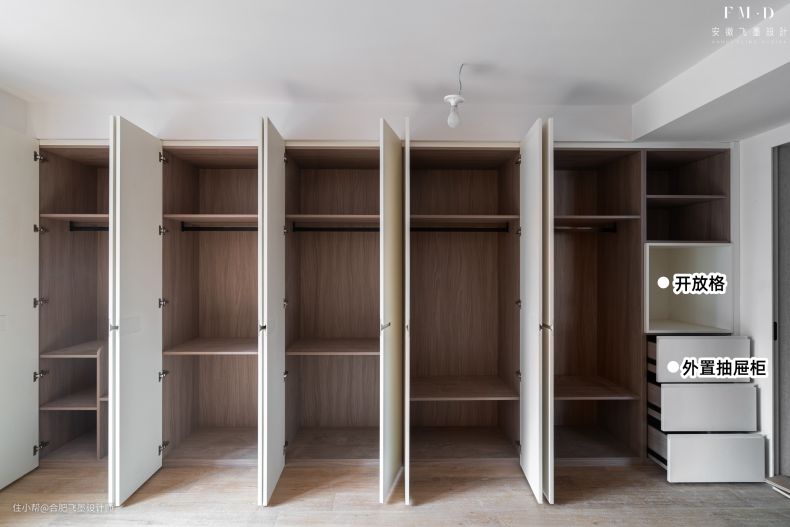 衣柜右侧做开放格+外置抽屉柜,一来看上去更具层次感,二来也能满足杂物、小件衣物的存放需求,归置整理也好拿好取,很是方便。