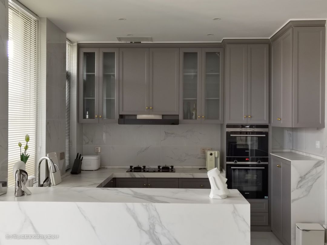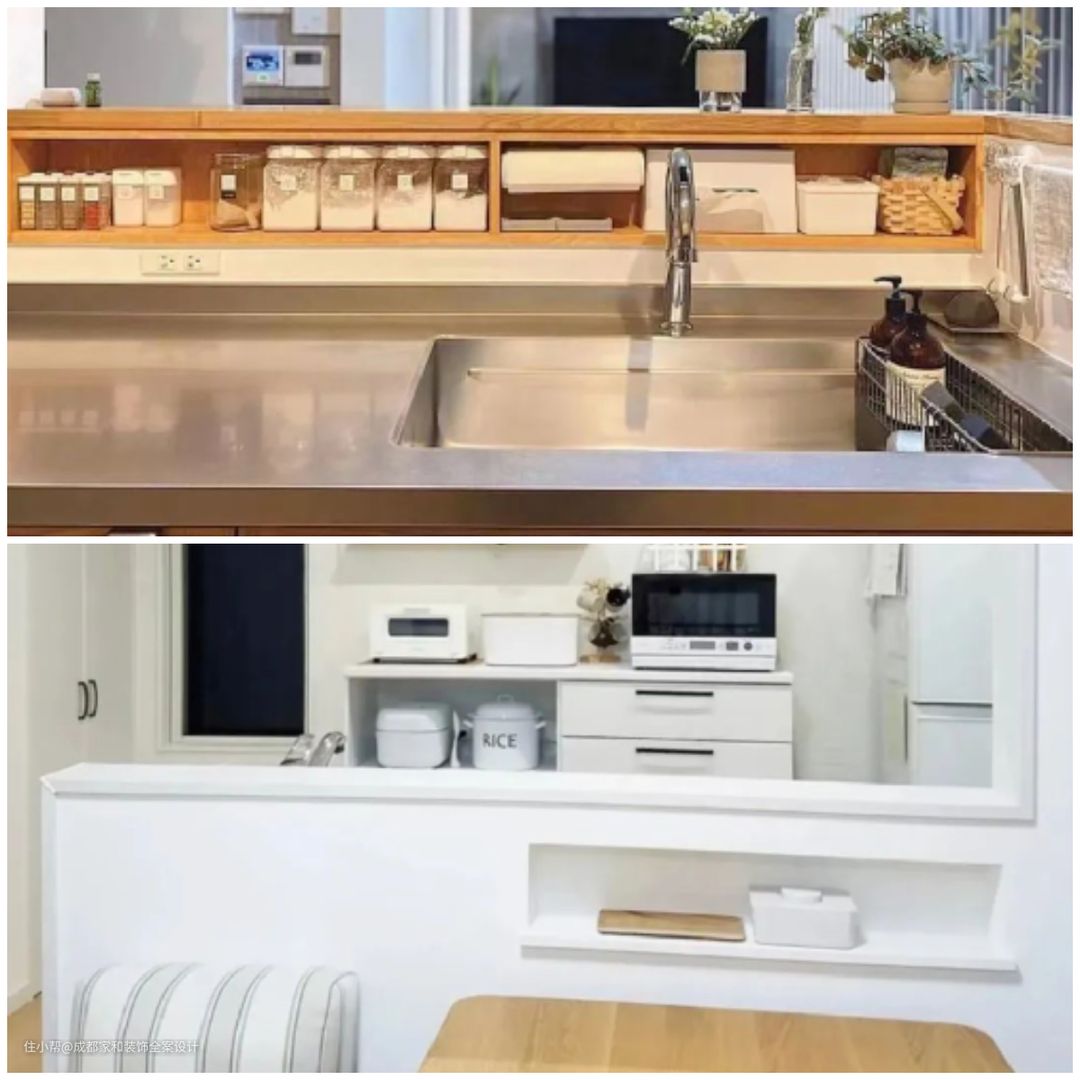 针对开放式厨房设计,可以将操作台加高20cm,不仅能遮挡凌乱的台面,还能在加高的位置做壁龛收纳或者加装插座,不管内侧还是外侧都可以在需要的位置做壁龛。加高台面上还能放一些装饰品或绿植,避免单调呆板。