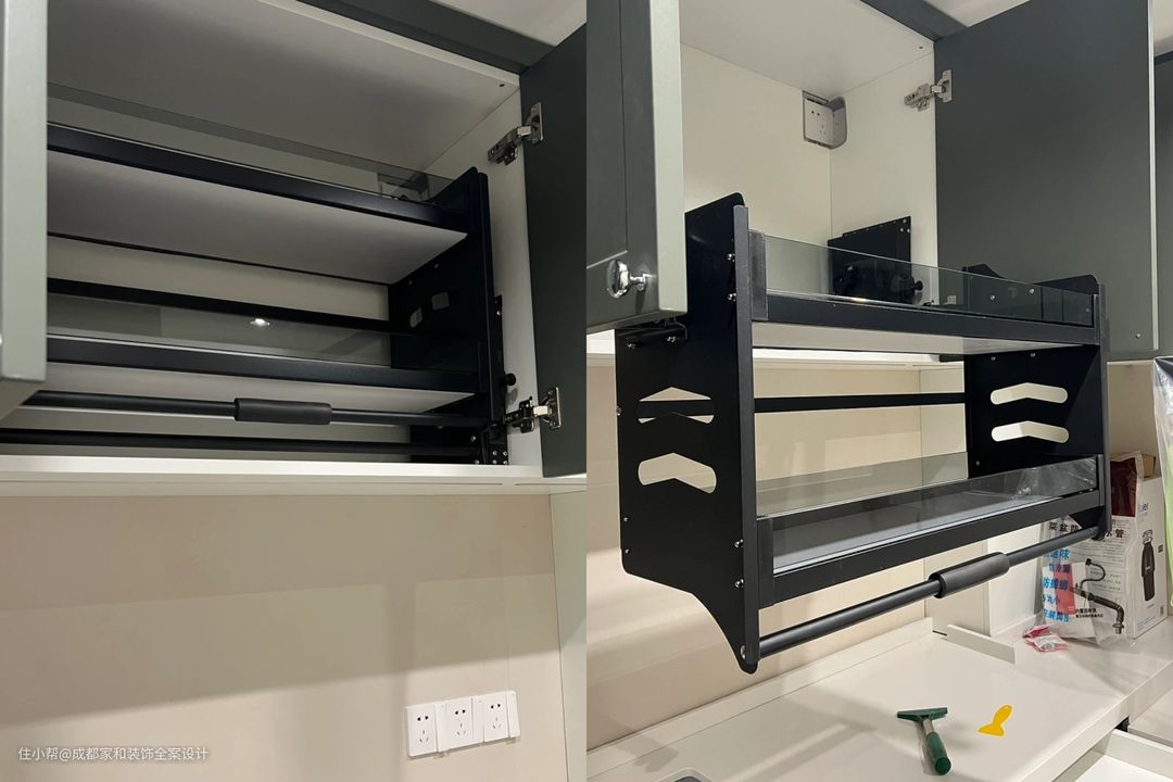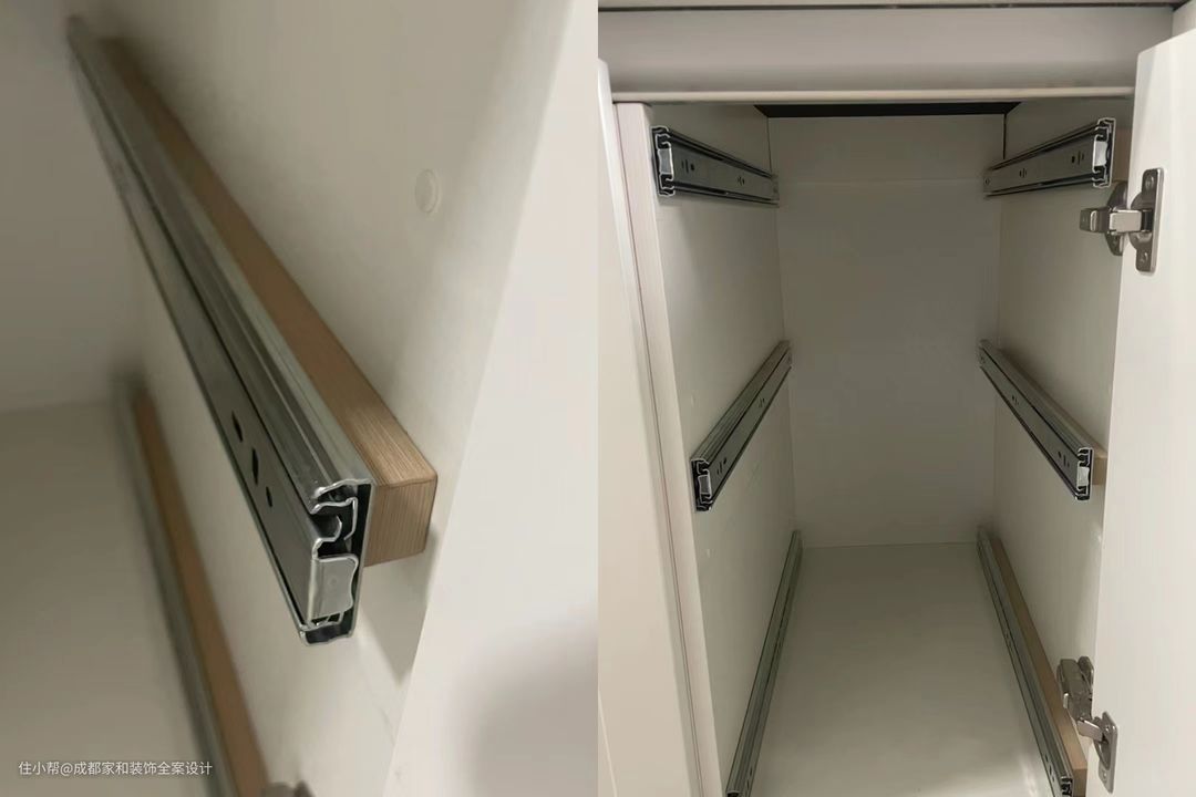 一般来说,定制橱柜的时候超过三个抽屉就要加钱了,所以大多数人选择使用隔板,隔板省钱,但最大的问题就是不好收纳,放在里面的东西不好拿、隔板高度又浪费,不如选用高度可调节且可抽拉的置物架,能够达到抽屉的效果,提高柜子的利用率。