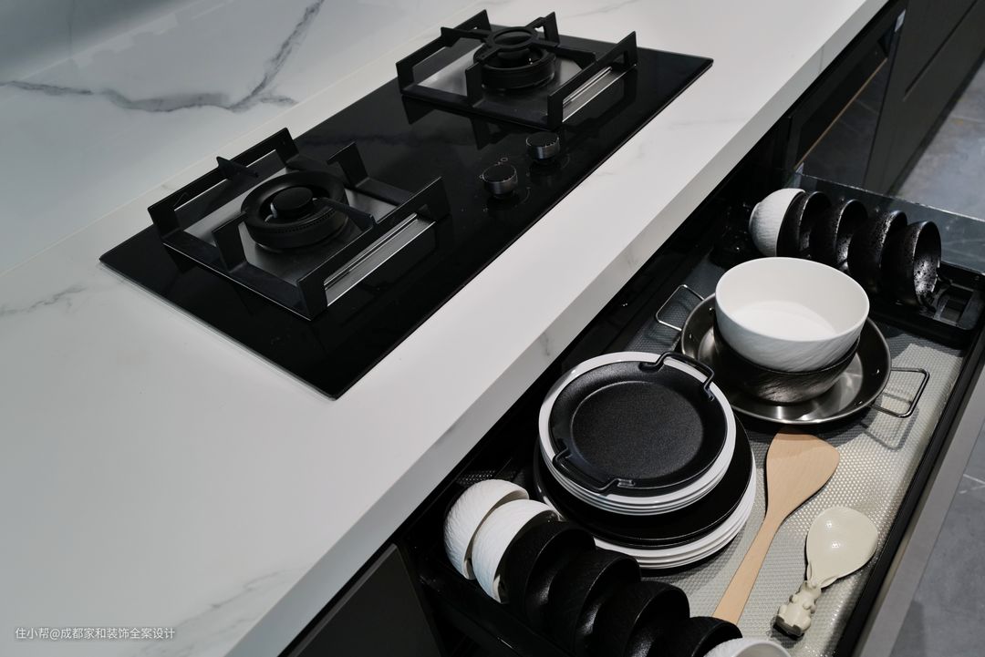 ④橱柜本身设计中,抽屉比常规的隔板收纳更方便,分类更细致,如果装修预算比较充足的话建议地柜做成抽屉收纳更好。