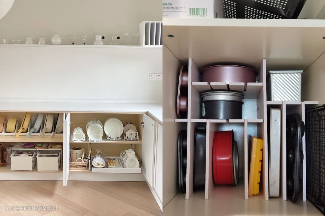 抽屉内部可以用碗碟架、塑料隔板、文件盒做简单分区,碗盘尽量竖向放置,方便拿取,锅具可以放在最下层。最上层可以做一个窄版的抽屉,专门放置勺子、叉子和筷子等餐具。