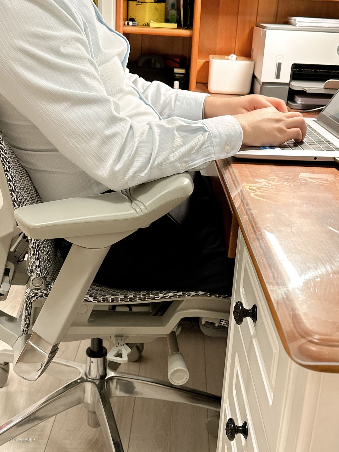 楼主和老婆正在使用的Ergonor 保友Pofit 2 代人体工学椅,是一款高端智能的居家办公家具。它搭载第3代升级仿生黑科技,具有双重全脊椎支撑和8区分布均匀承托的强大效果,让老婆大人久坐腰椎间盘疼痛的症状得到了缓解;通过多部位、多维度精准调节,完美承载坐仰躺不同姿态的全身舒适;6维悬浮扶手是一大亮点,满足不同姿态下的手部放置需求,舒缓手臂及肩膀酸痛;手动+电动双模操控,一键即达,便利与趣味兼有;还有预装配无需安装、PU滑轮、挂衣钩等贴心设计,契合便捷省心的品质生活。
