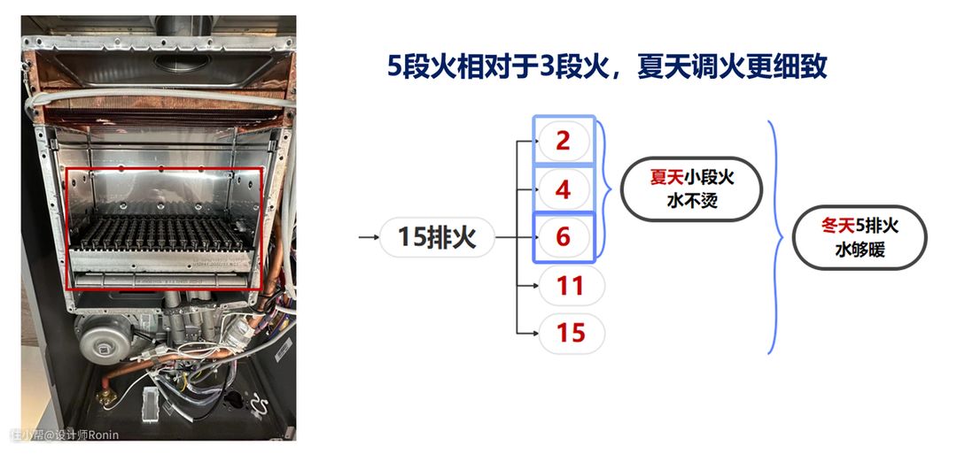 KL7采用的是5段15排火,这样的好处就是相对于3段火5/10/15火排切换,5段火可以做到2/4/6/11/15火排切换,最小功率低至2KW,夏天火力更小,能够做到夏天小火水不烫的效果。