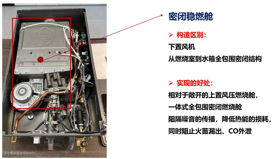 简单来讲,密闭稳燃舱就是,从燃烧室到水箱全包围密闭结构,同时下置风机构造,有效提高了燃气热水器的防风能力,在强风天气下依然能够正常使用,使用安全、可靠、稳定燃烧。同时密闭稳燃舱的结构,能够实现更好的隔音效果。