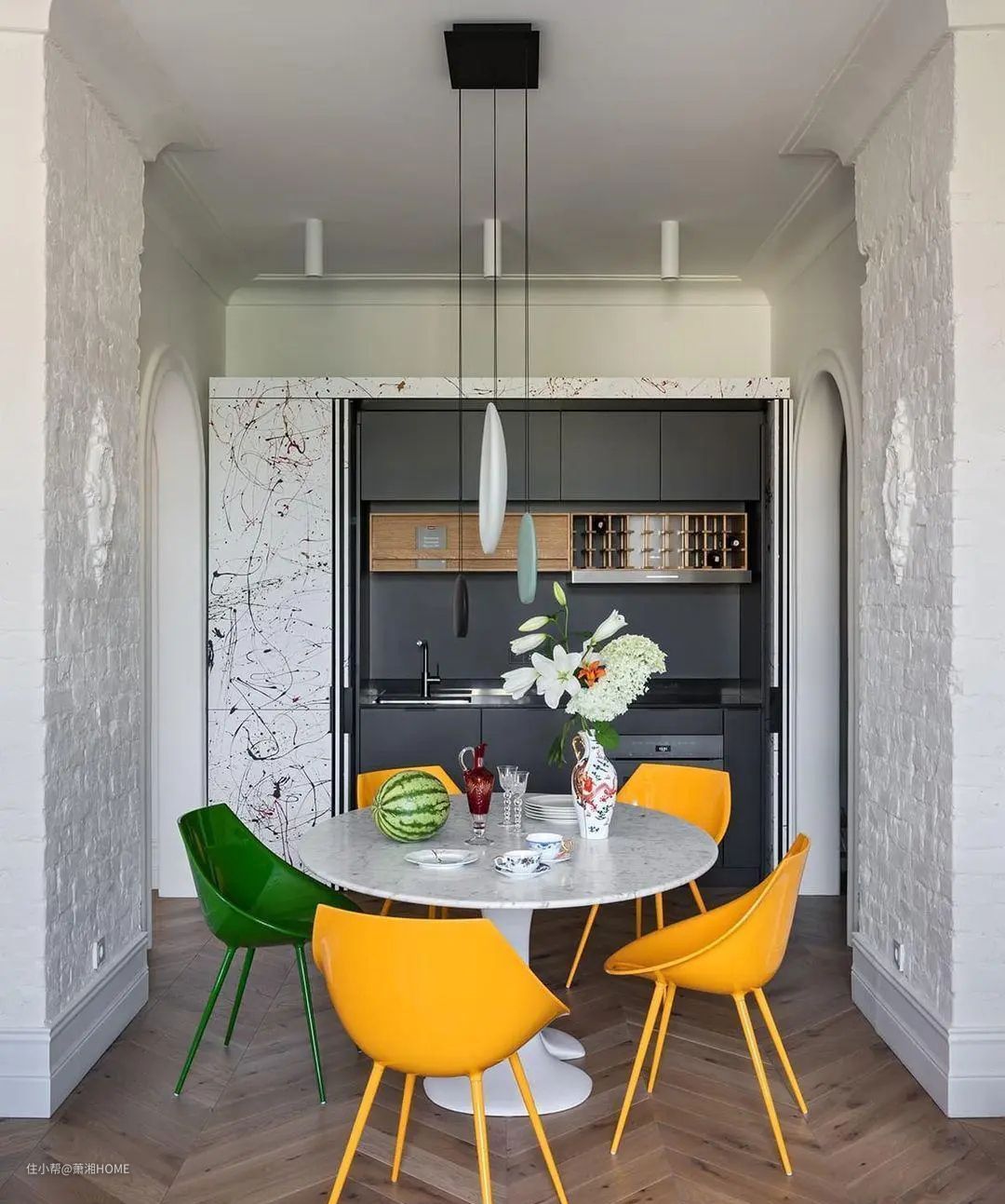 餐厅给人的设计感觉非常有个性化,两侧的墙面使用了白色文化石,中间一面墙做了柜子,柜子的门板非常具有艺术色彩。不规则的乱纹形式,让整个柜子像是一幅挂画。