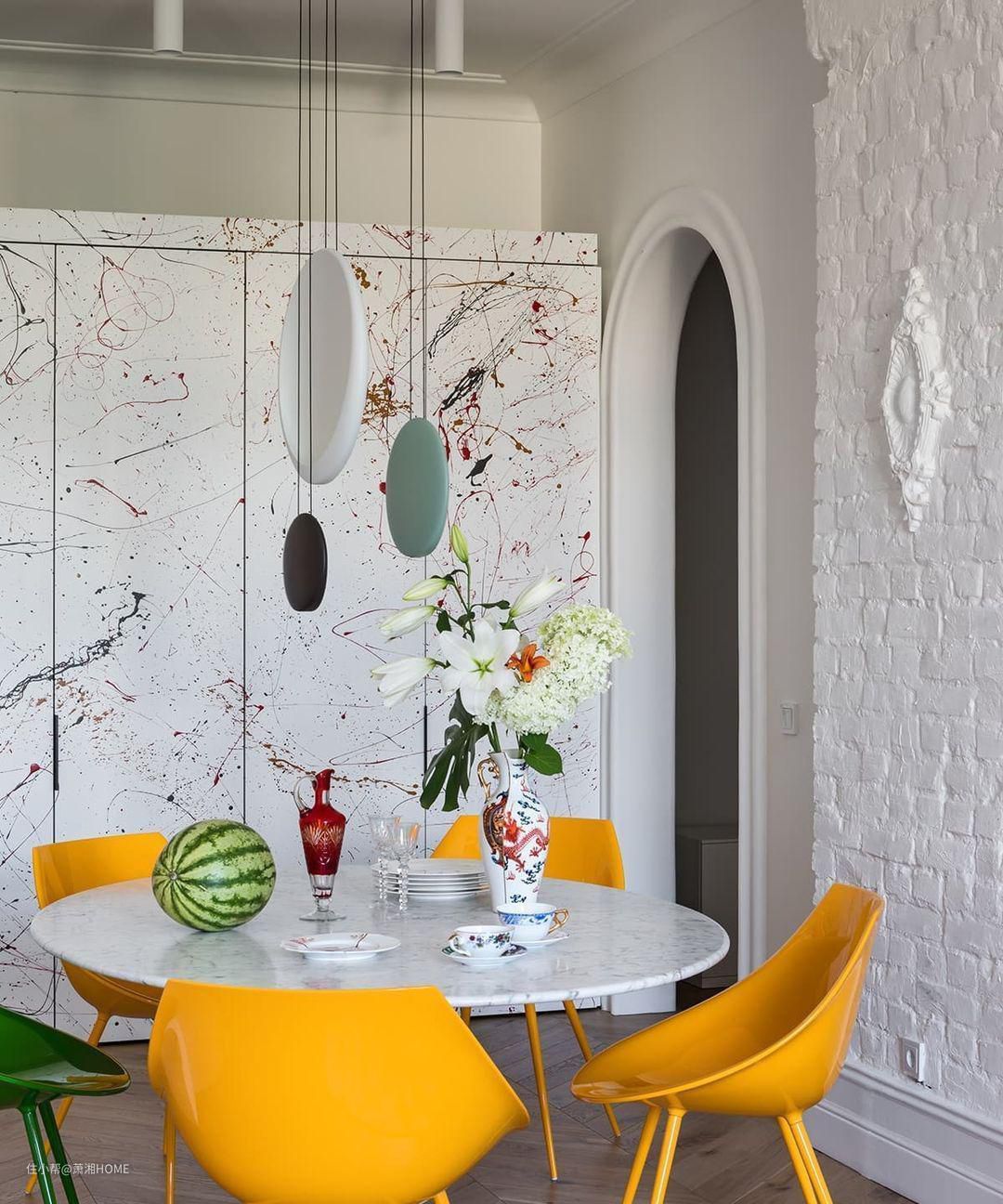 餐厅的灯具像极了围棋的形状,大小不一,颜色不同,非常有艺术气息。而餐椅的黄色以及绿色非常漂亮,而且款式也是国际时尚经典款式。