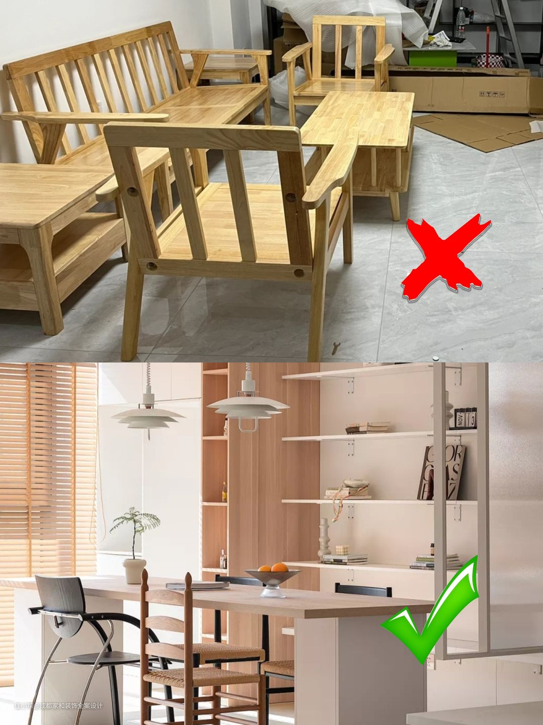 这一点是90%原木风显廉价的主要原因,原木风并不是只要有木质家具就行了,想要更好地效果就要避免使用北欧和日式的传统实木家具,而是选用更加规整的设计,线条造型简洁利落是基本原则。