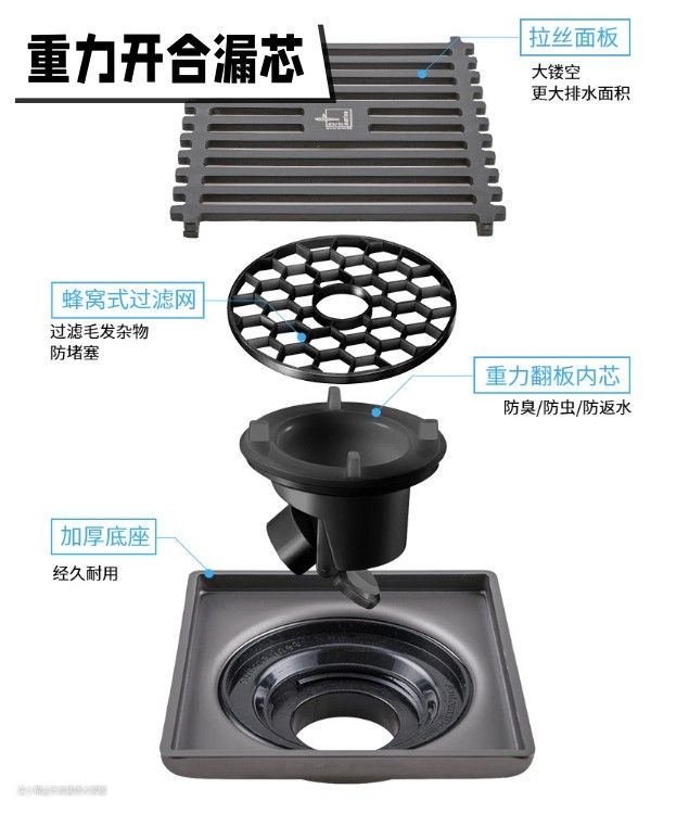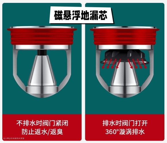- 优点:排水速度快,防臭效果好,原理分两种两种,一种是弹簧式,用弹簧拉伸密封芯下端的密封垫来密封,另一种是磁铁式的,用磁铁吸合密封盖板来密封。