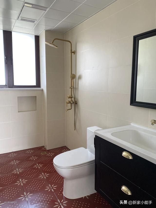 卫生间空间足够,但是没有做干湿分离,不影响使用。地面选择的瓷砖非常个性,相信我们都没有怎么见过这种款式,而且搭配的浴室柜颜色跟地砖颜色一致,搭配起来很协调很舒服。选择了金色的花洒,很个性。