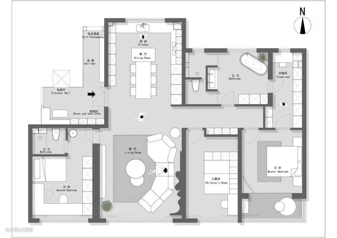 最后会客娱乐需求则要求客厅沙发的布局足够灵活,既能满足大家同侧观影的需求,又能满足大家面对聊天的需求。