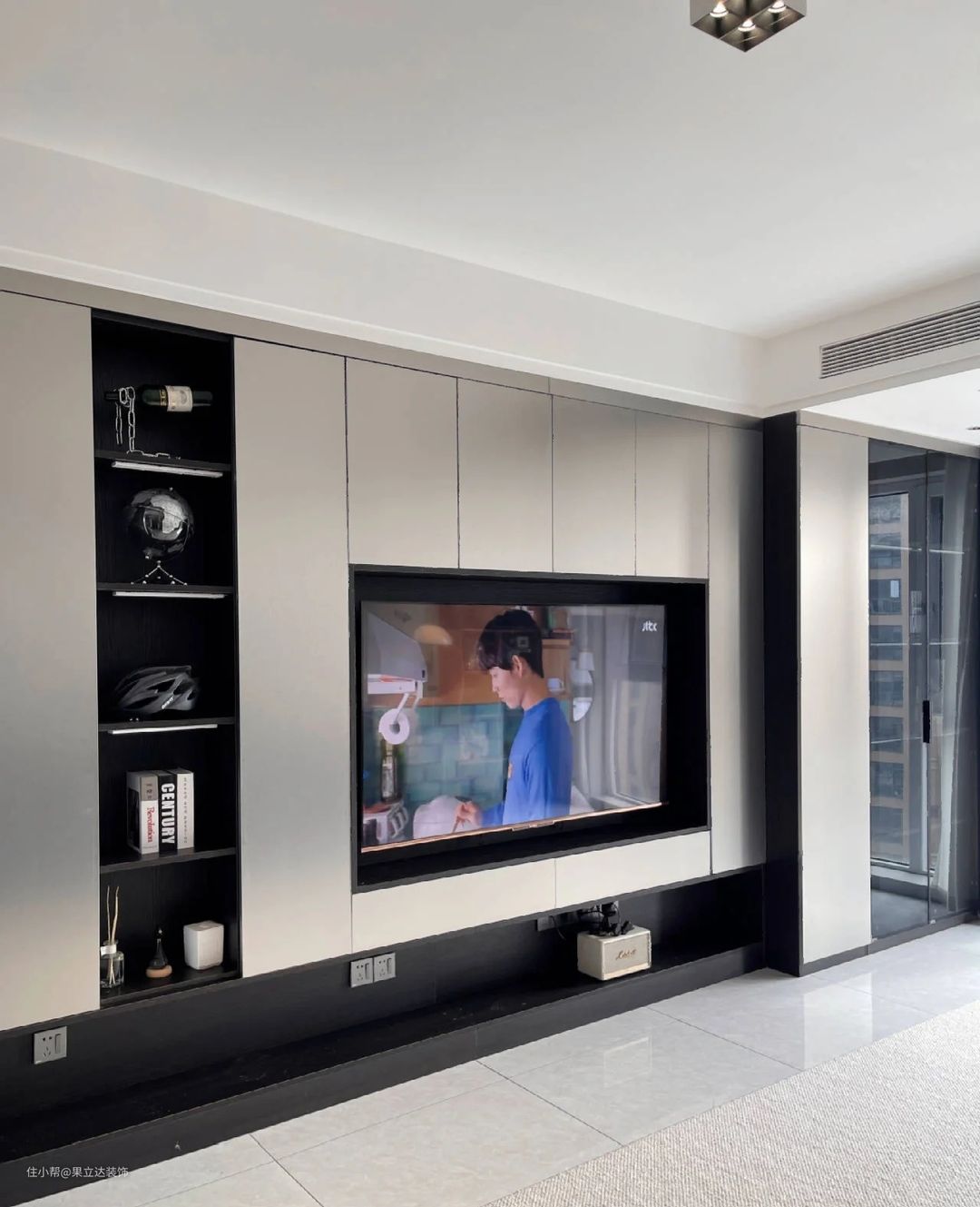 高级感极简电视背景墙果立达装饰2023-04-152023年最受欢迎的两种电视背景墙悬浮背景墙:用欧松板做框架,石膏板打底,上下预留灯带,然后刮腻子刷乳胶漆,内嵌部分全部刷黑漆,装上灯带,氛围感一下就起来了。做满墙电视柜:整体看起来干净利索,柜子实用性高,收纳能力yyds。
