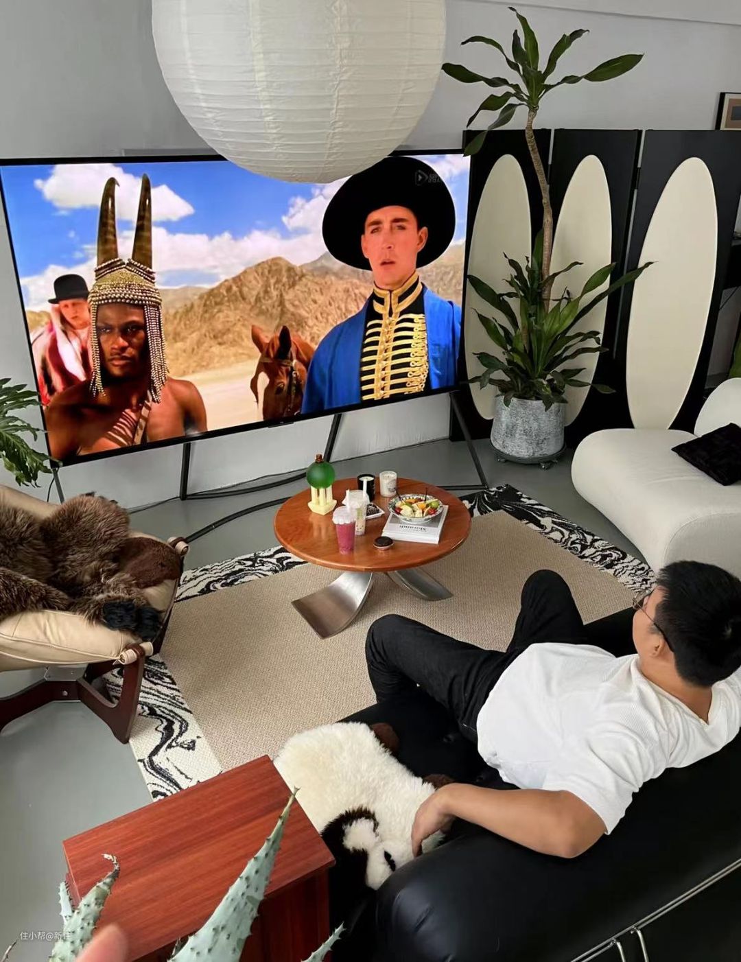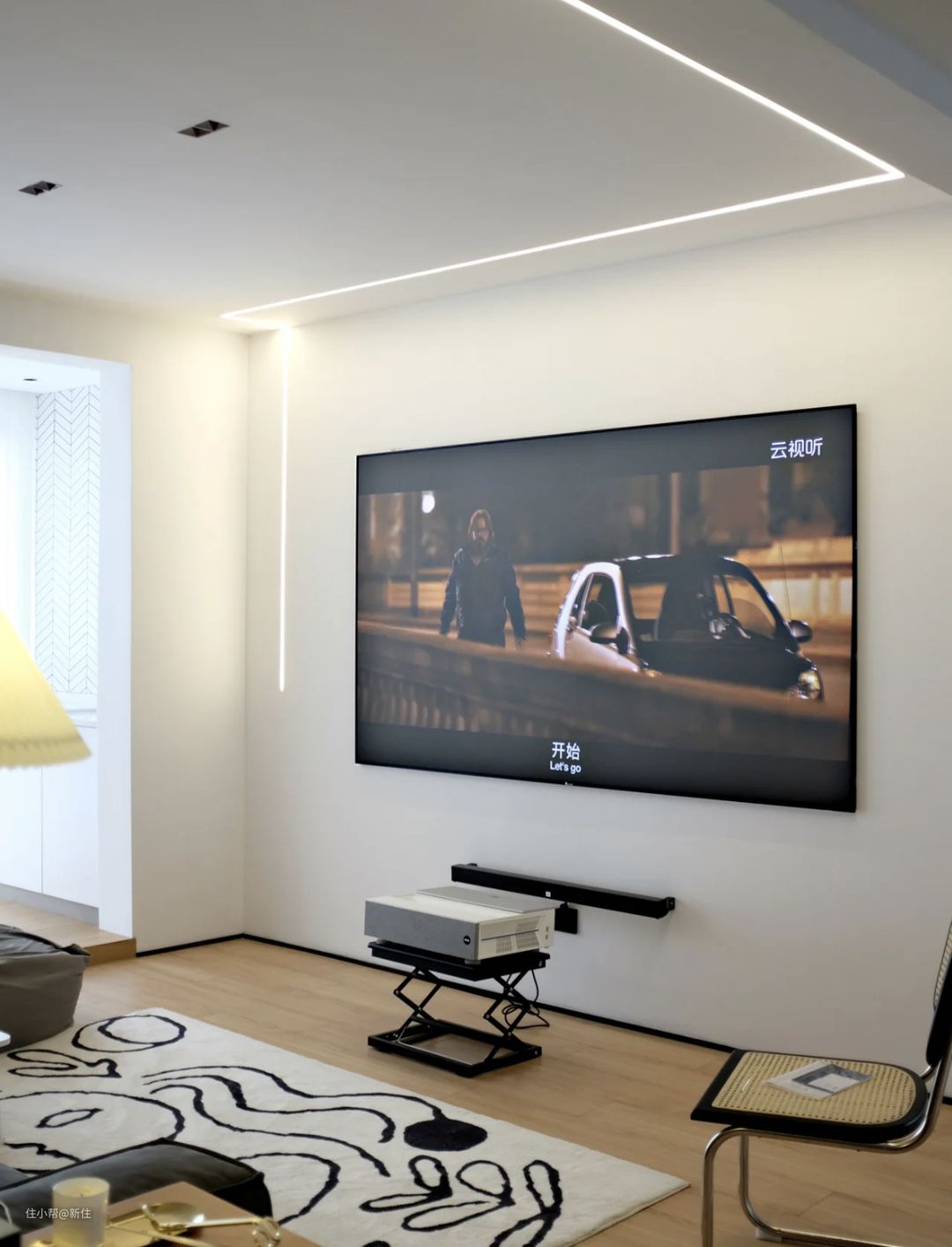 这种电视有一个好处就是,它薄儿大,即使没有什么装饰的大白墙,在它的映衬下,就能变得现代感十足。