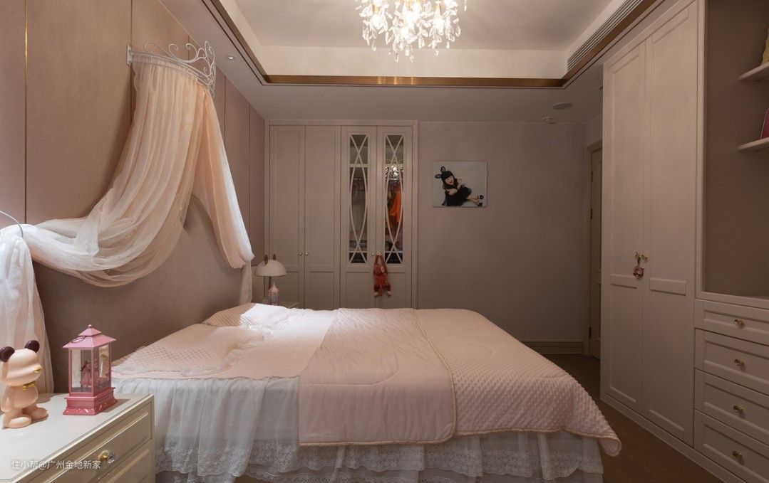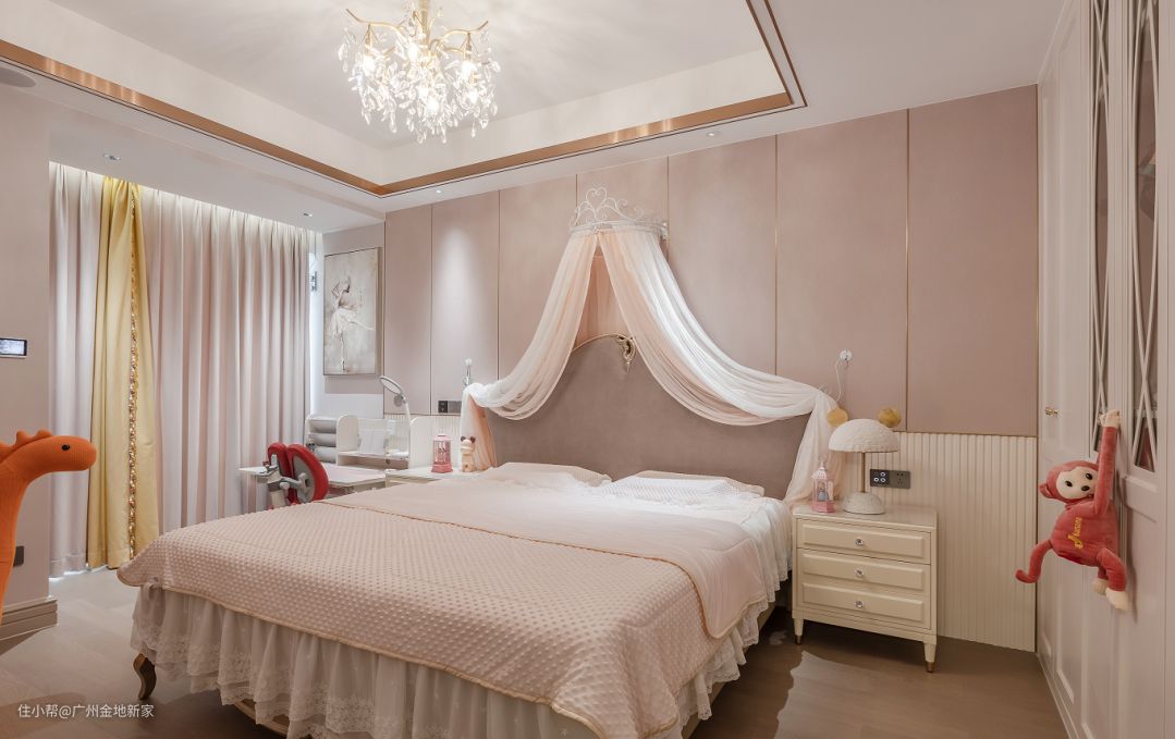 来到儿童房,就好似进入到了充满粉色泡泡的美好世界,床头用软包拼接格栅板,床加入了蕾丝蚊帐 做成一个公主床幔,让女儿在这粉粉的摇篮中安静的入睡,整个空间用柔皙粉和象牙白的色彩搭配,给她们一个梦幻的公主梦