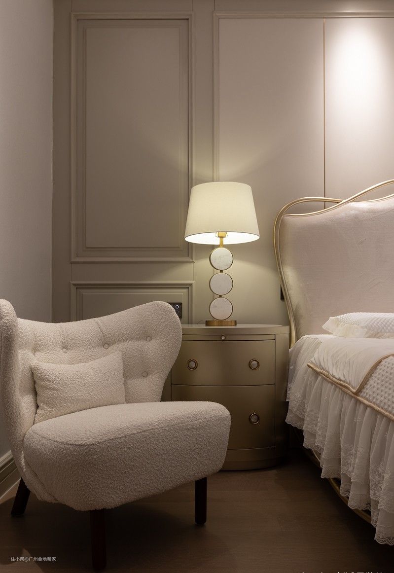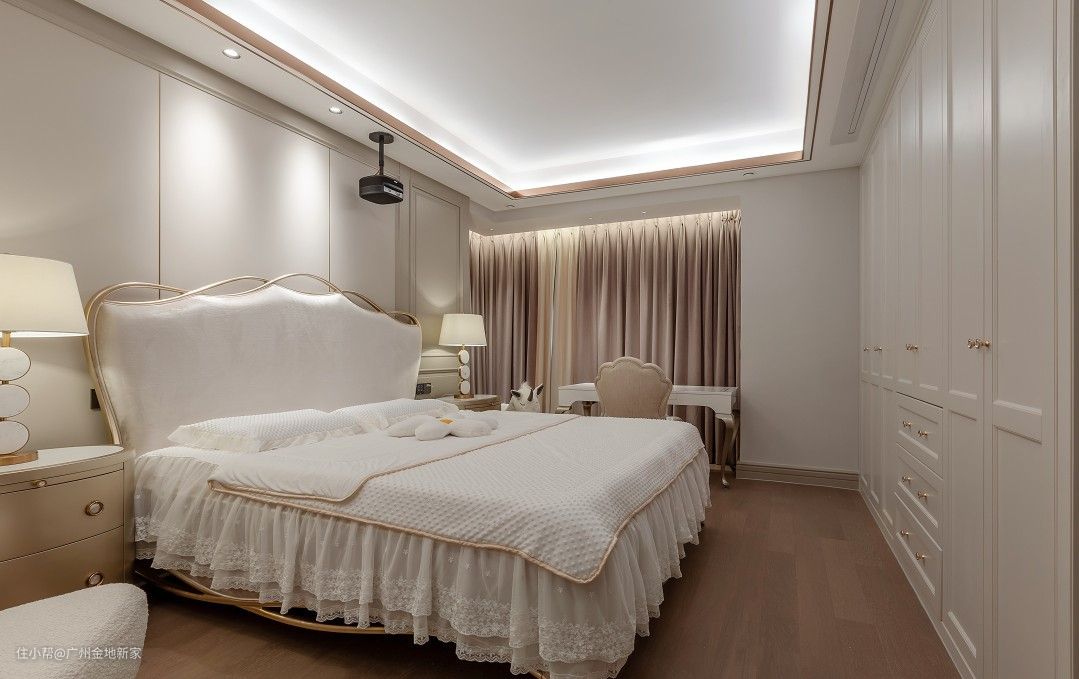 卧室的主调以香槟金为主,搭配窗帘的烟紫色与衣橱的极简白,以及蕾丝、布艺和木质等材质的运用,床头还摆上一只天鹅椅+羊脚蹬,将卧室的奢华和舒适性融为一体,实用又美观。