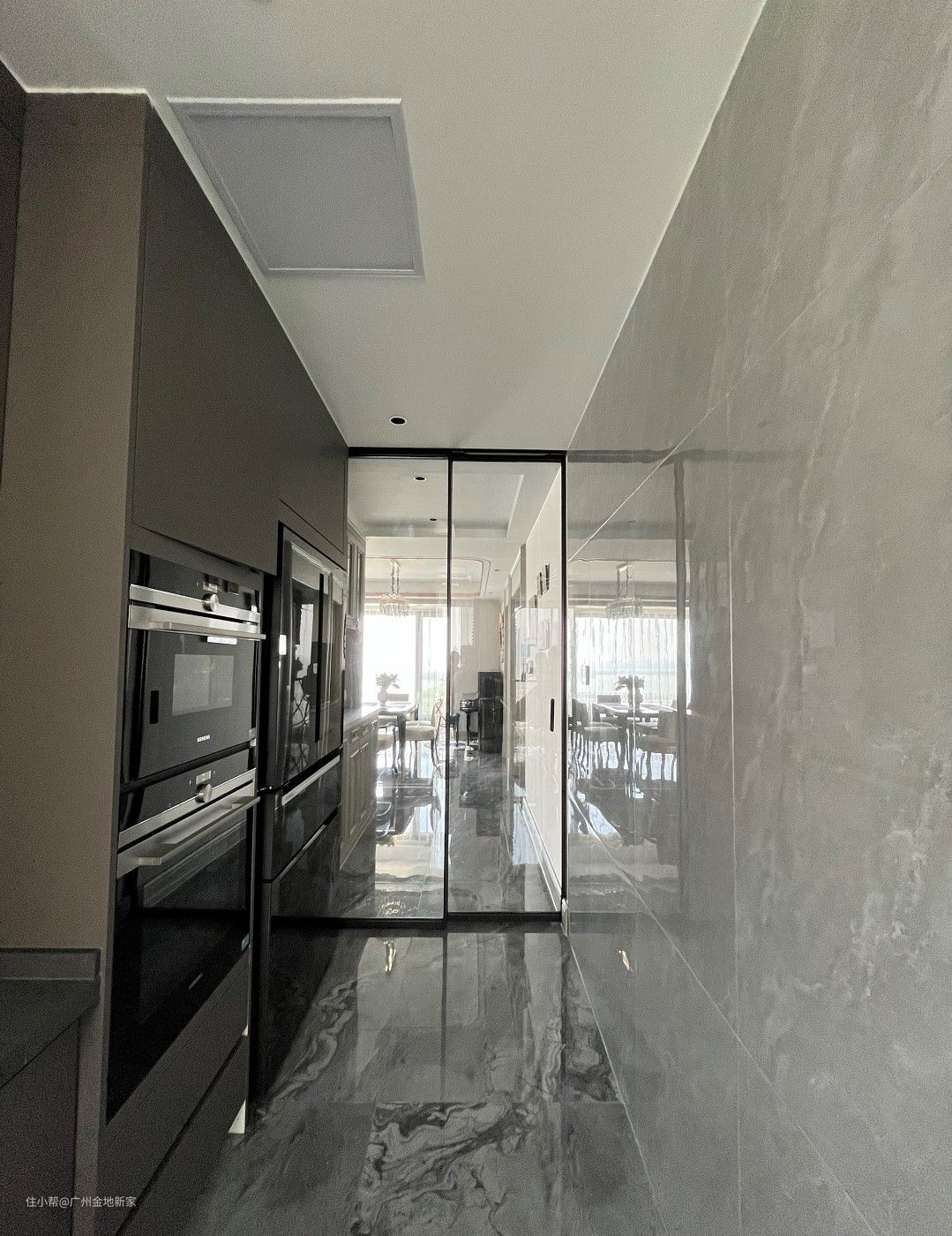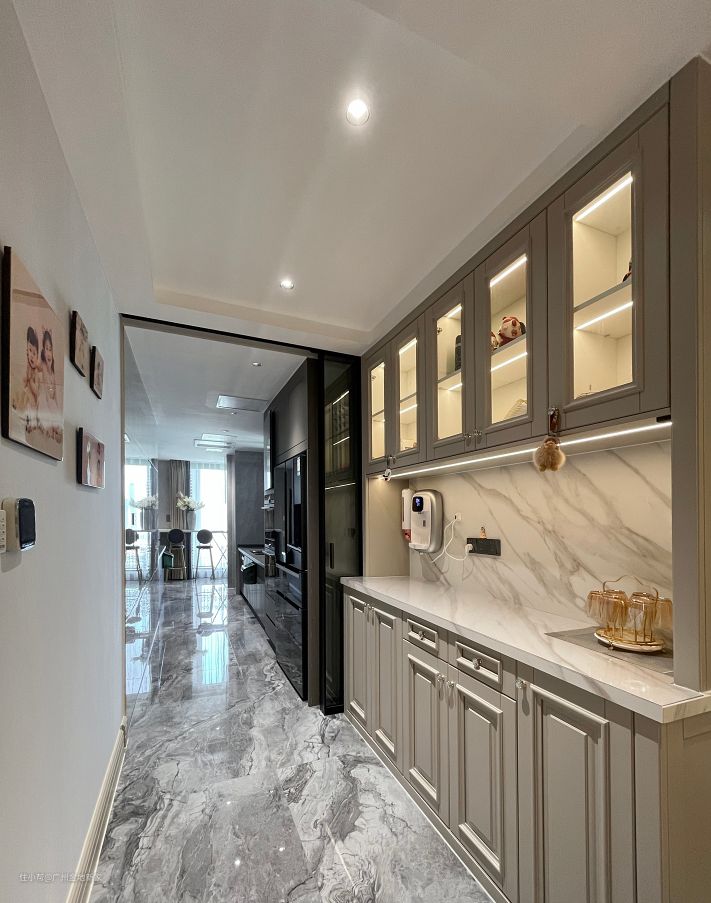 来到厨房的过道处,就能感受到空间超强透亮的延伸感,这得益于窗户带来的良好采光和瓷砖反光的效果。 西式区更准确来说是一个餐边柜,设置了管线机(做水电工程的时候就需要做好这部分),方便接水又容易清洁。插座用的是 带开关的是五孔双控样式,省电、方便使用又能减少插头使用的损伤。这一部分除了增加了餐厨两处的收纳空间,也能作为水吧、酒柜使用。一黑一白的配色也巧妙地对这两个空间进行了分区。