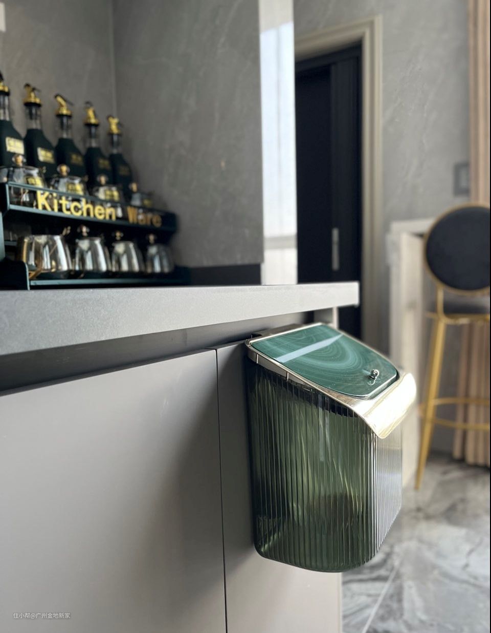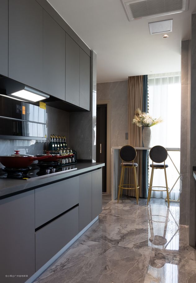 利用了黑玻的上轨道滑动门,将中西两厨分区,可以防止做饭的油烟和炒菜味弥漫到屋内,同时又能保证良好的采光以及简洁的视觉面。