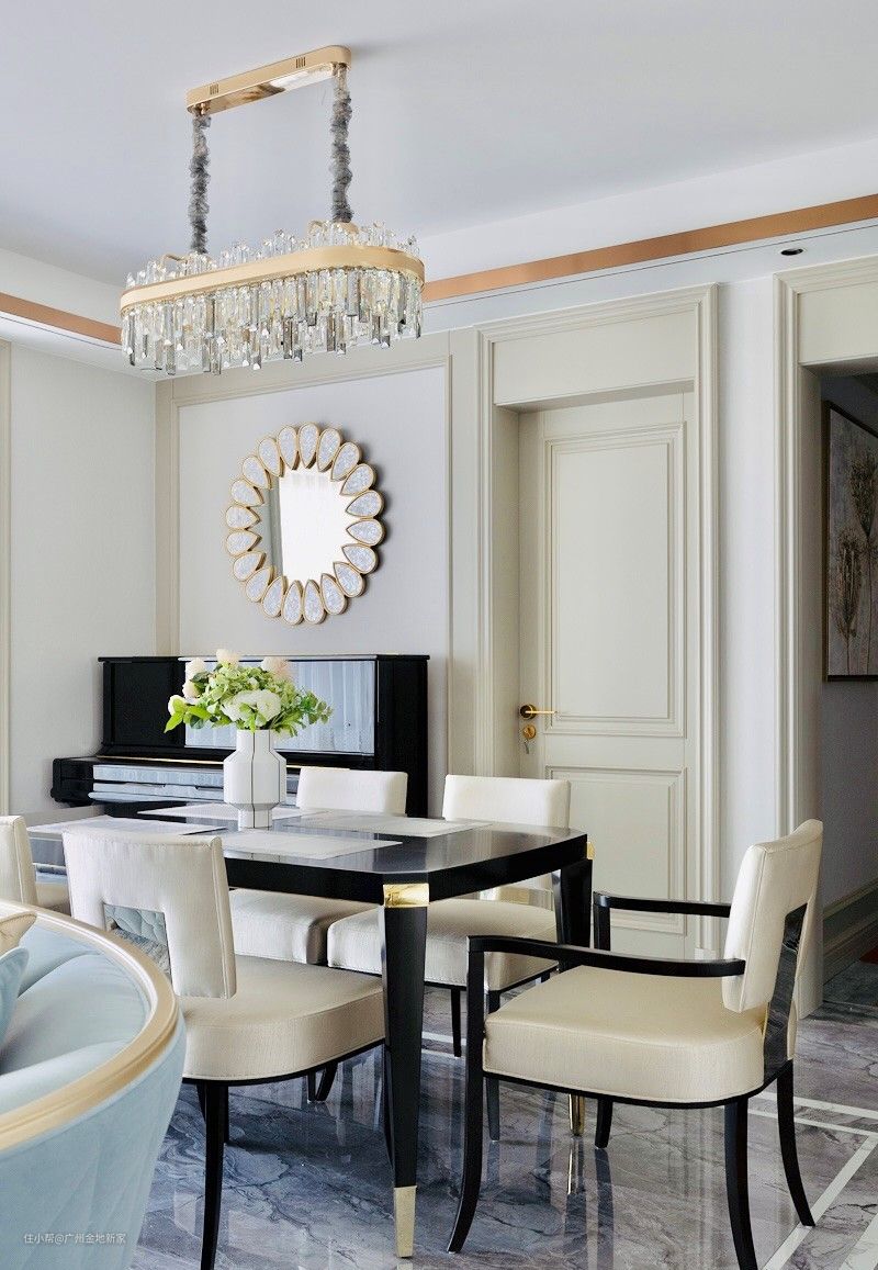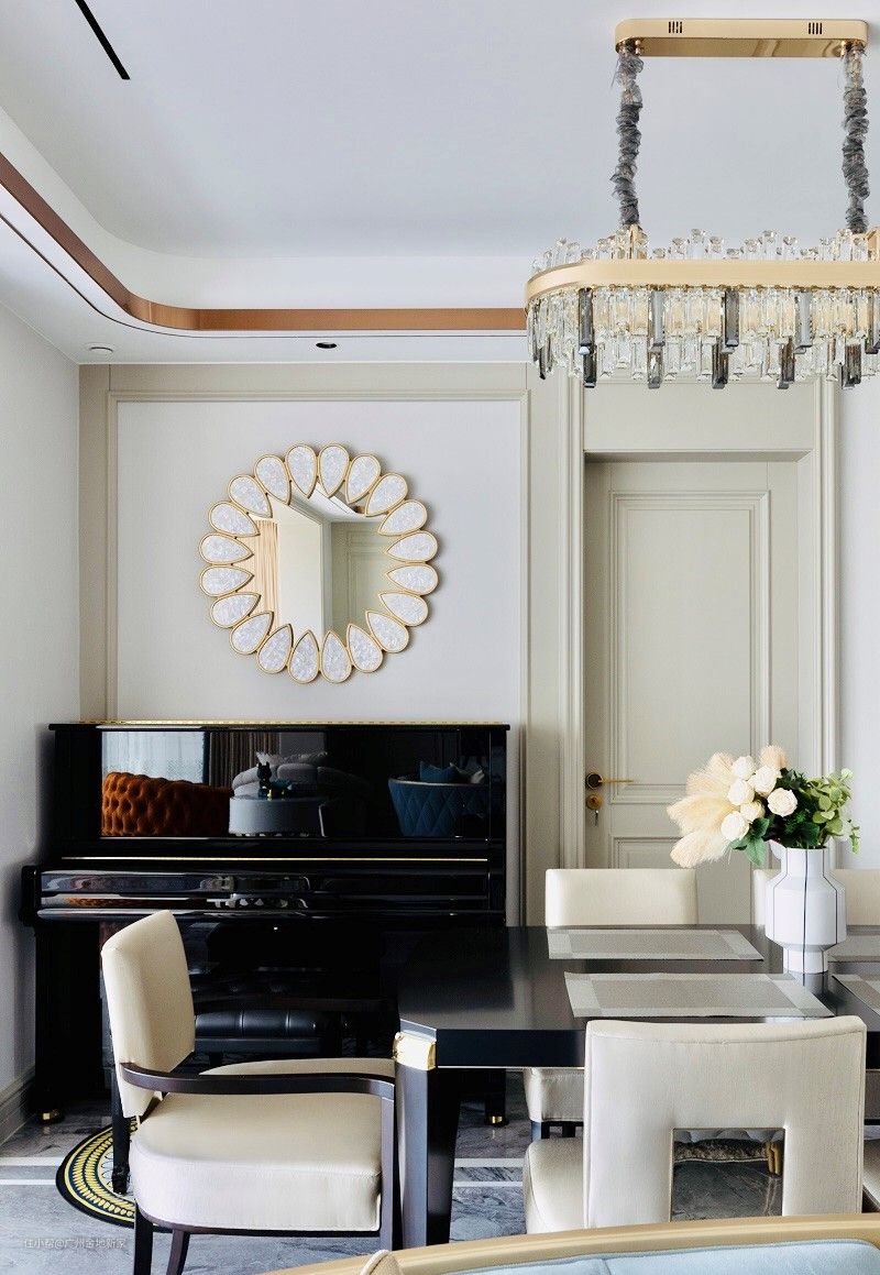 餐厅处加上了水晶的吊灯,在这宽敞的空间中弥补了纵向空荡的美感,视觉上更加平衡。