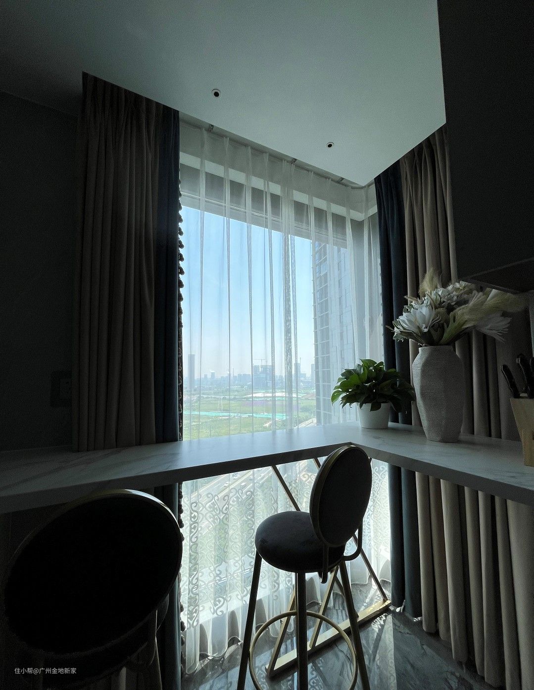 厨房往内,与厨房台面平行的基础上 做了L型的小吧台的设计,平时的一个人吃饭或是简单的早餐都可以在这里直接解决,还能悠哉的欣赏美景。