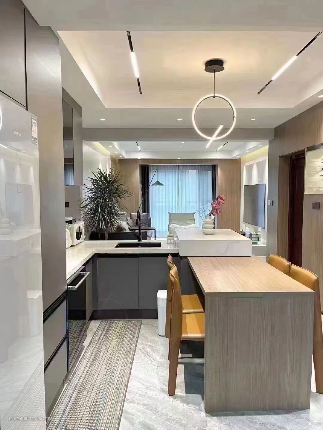 里侧连接L型开放式厨房,融入黑色系家电