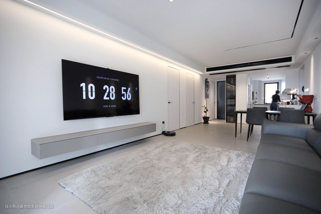 为了打造极简的家居环境,地板通铺灰色系800*800柔光砖柔光地砖,提升了空间的高级氛围感。一字型皮质沙发质感满满,而且不占空间。配备地暖,实现夏季制冷、冬季制热功能,带来双倍舒适享受。