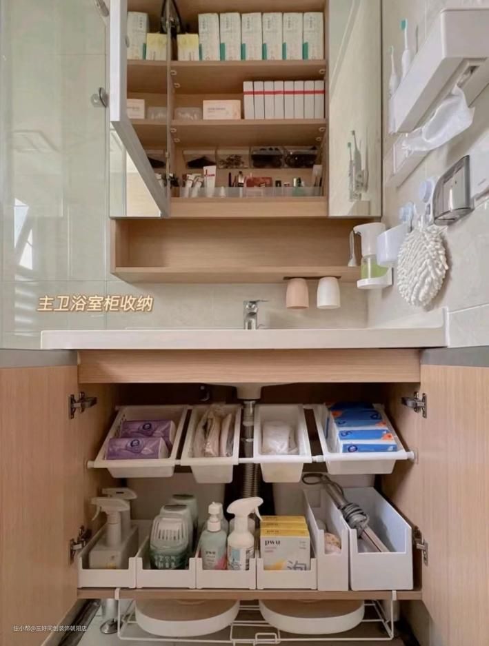 浴室柜最好还是安排上一个大的开放格,可以放常用的护肤品,这样台面就不用放东西,清洁很方便,牙刷/漱口杯/擦手巾都可以上墙,取用和归位都很方便,形成习惯就不会乱放了。