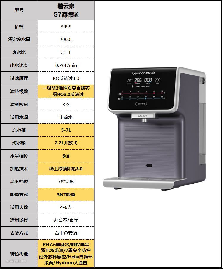 碧云泉从G5开始,采用反渗透过滤方式,也很有诚意,直接用的陶氏膜片,1500L额定量,100G通量规格,在台上式款式里算比较大的。