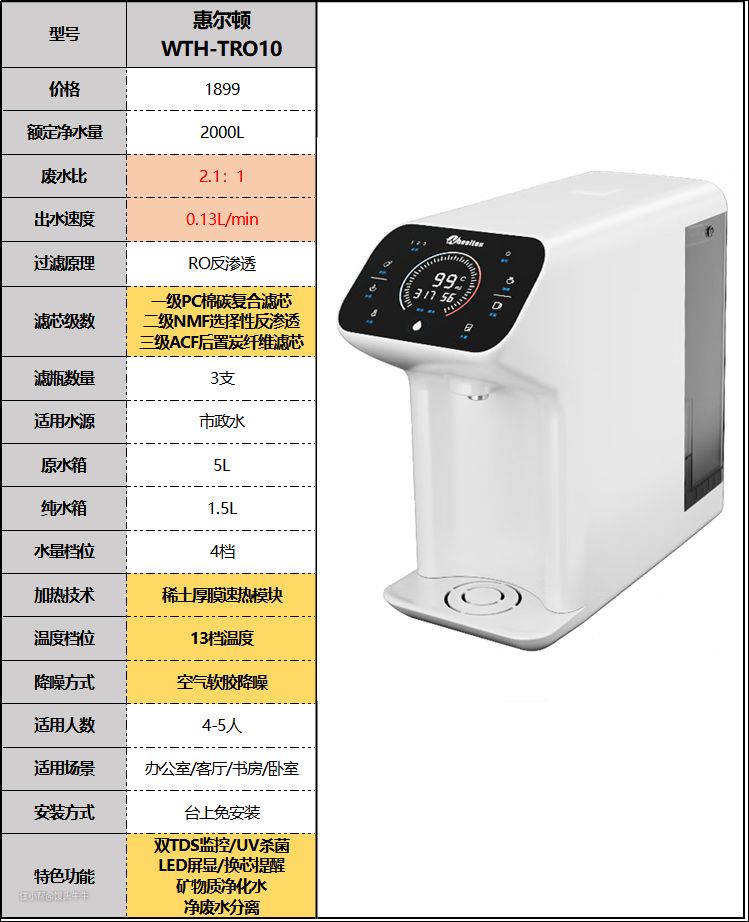 惠尔顿的这款性能还是不错的,保留多种矿物质,13档温度调节,带有防噪音装置,可惜废水比2:1稍高。不过胜在品牌有保证。
