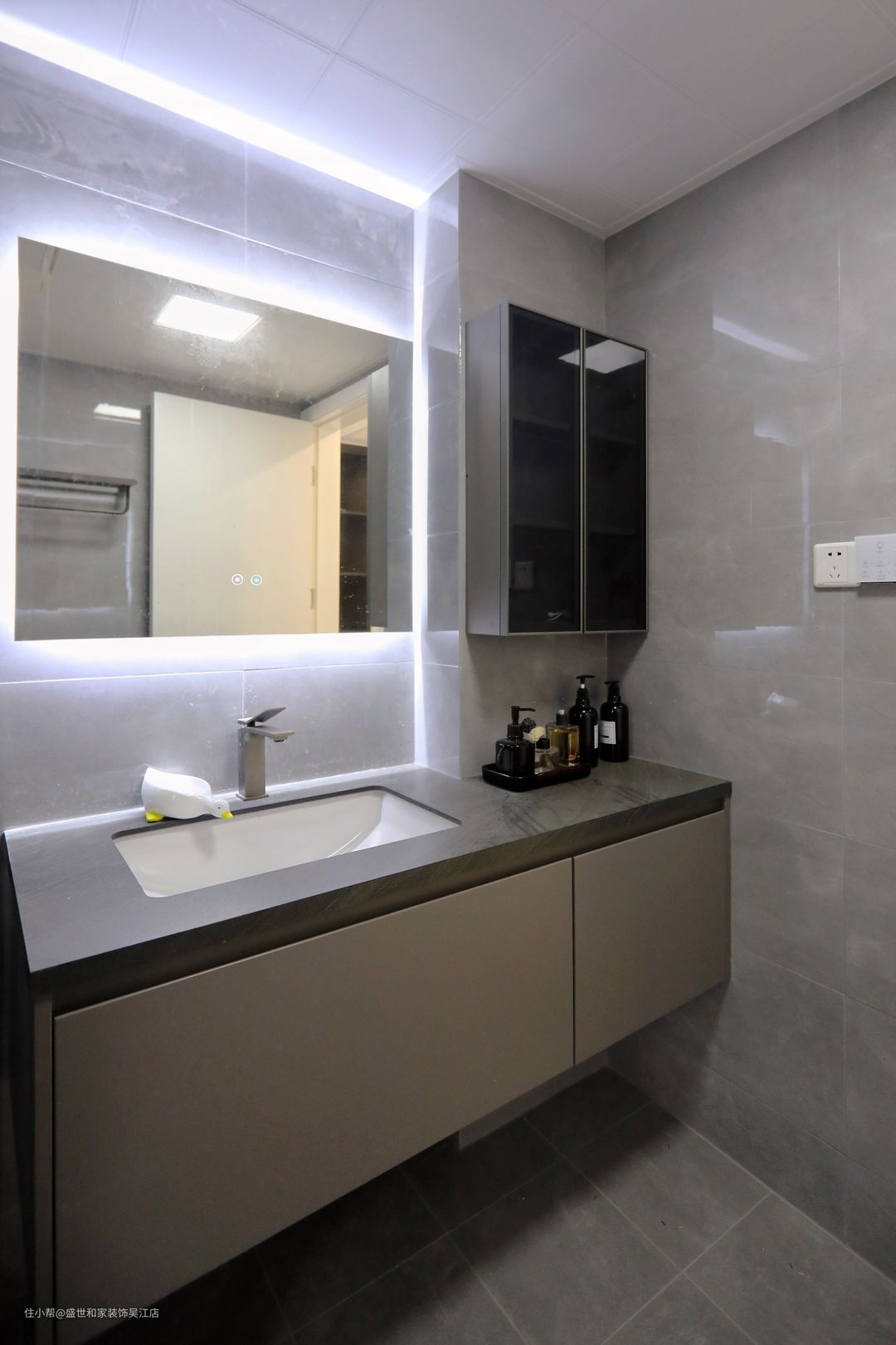 浴室柜悬浮设计,台面做嵌入式,便于打扫,简约的柜门将繁杂收纳其中,双边灯带增加空间质感。