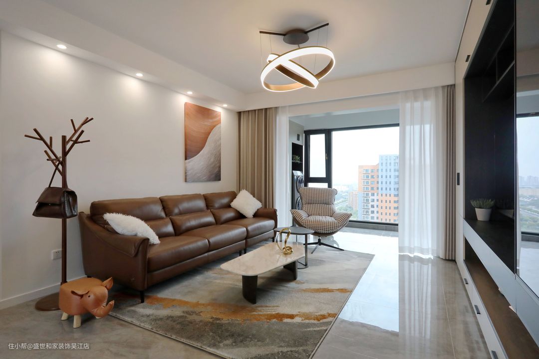纯白的沙发背景墙搭配流沙装饰画,皮质沙发搭配柔软地毯,灵动橘色与淡雅灰色的色彩碰撞,激荡出鲜活的气场。