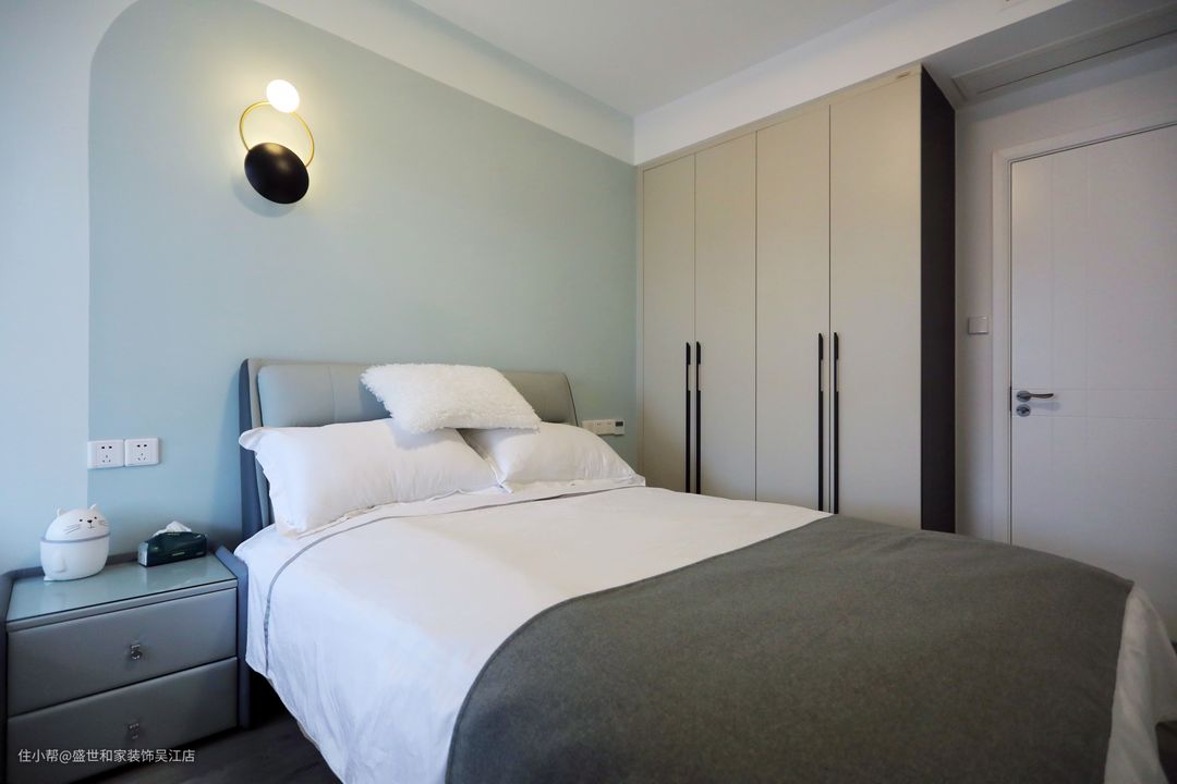 主卧在走廊的尽头,是整个家最静谧舒适的地方,床头背景墙以布里斯托蓝搭配奶油青提绿,高级配色的碰撞透露着温馨与疗愈。