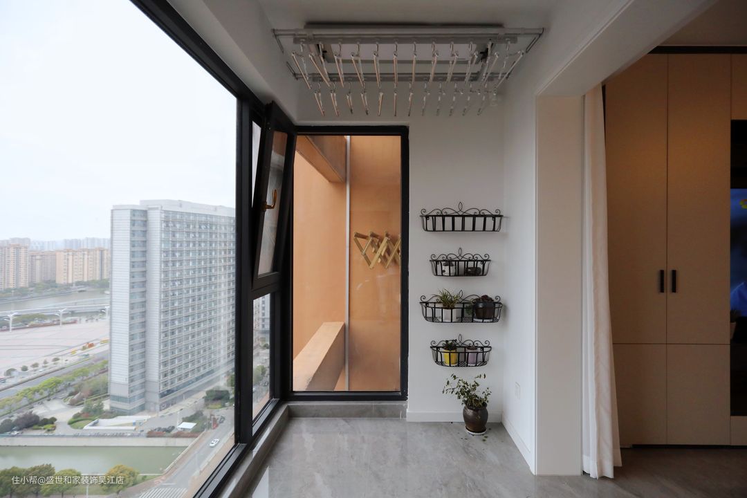 另一侧以铁艺壁挂花架上墙,摆上业主喜欢的多肉,为生活增添一丝活力,同时转角处保留原户型的落地床,扩大采光的同时,将晾衣架设置在这里,避免遮挡室内采光的同时,增加了晾晒功能。