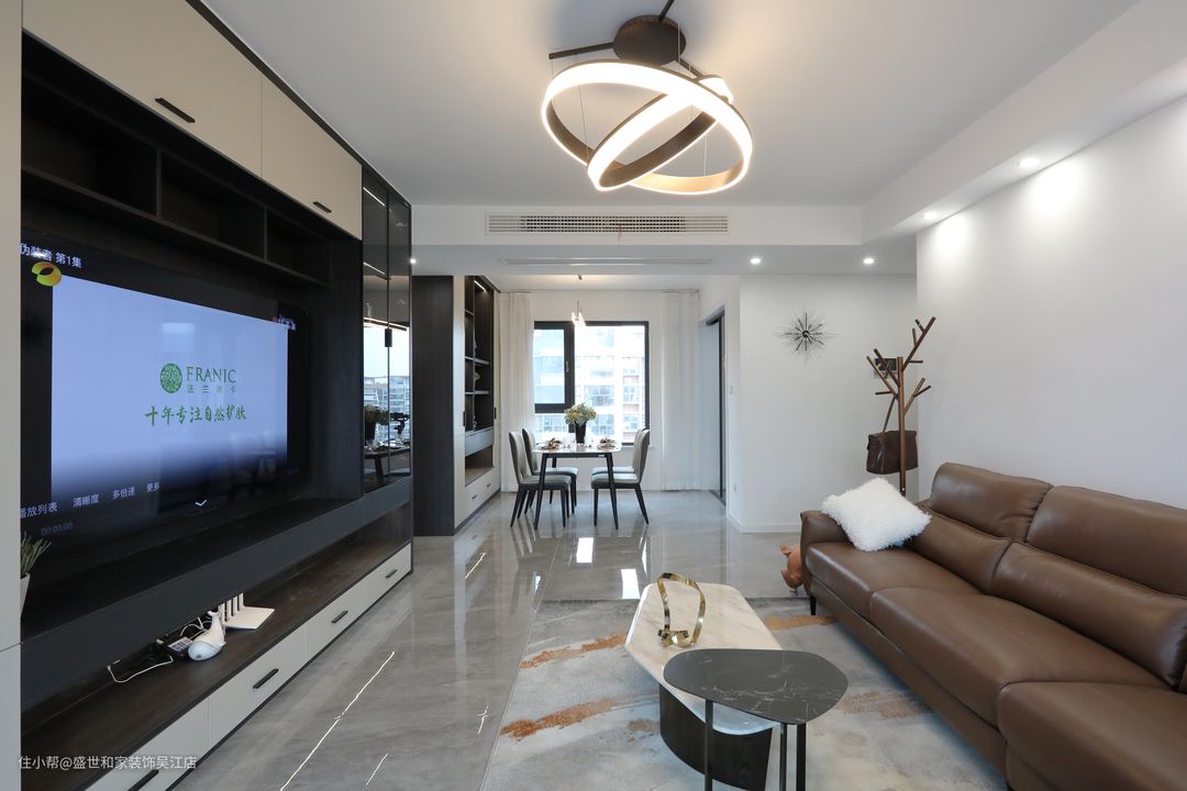 在客厅、餐厅、玄关的交界处,墙面挂着一个几何挂钟,简单的线条给空间一抹创意的装扮,呈现出结构分明的秩序感。