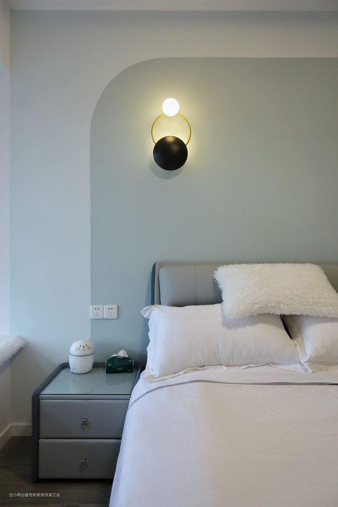 床头一侧做双头壁灯,增加氛围感,夜幕降临,关掉主灯,享受小壁灯带来的片刻静谧。24