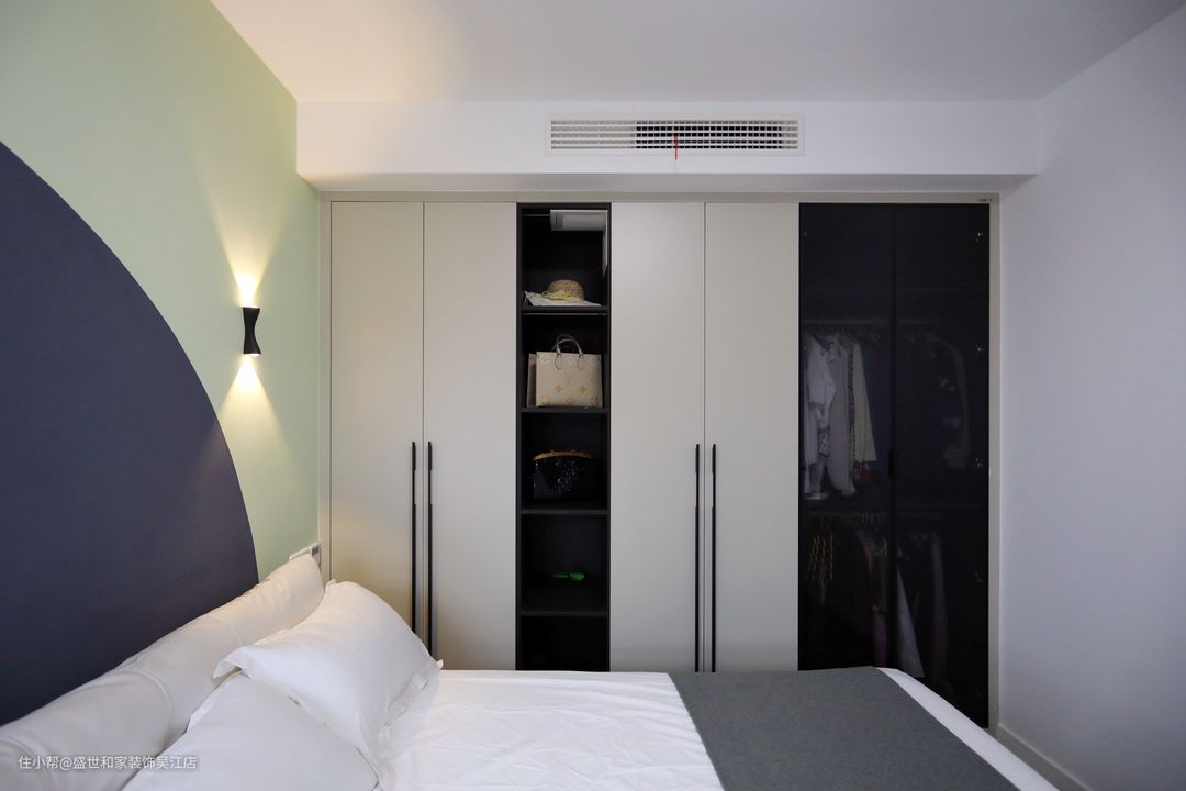 一侧做整面衣柜,顶部不会积灰,收纳能力加强,更具有整体性,配色依然以黑白为主,功能以便捷为主。
