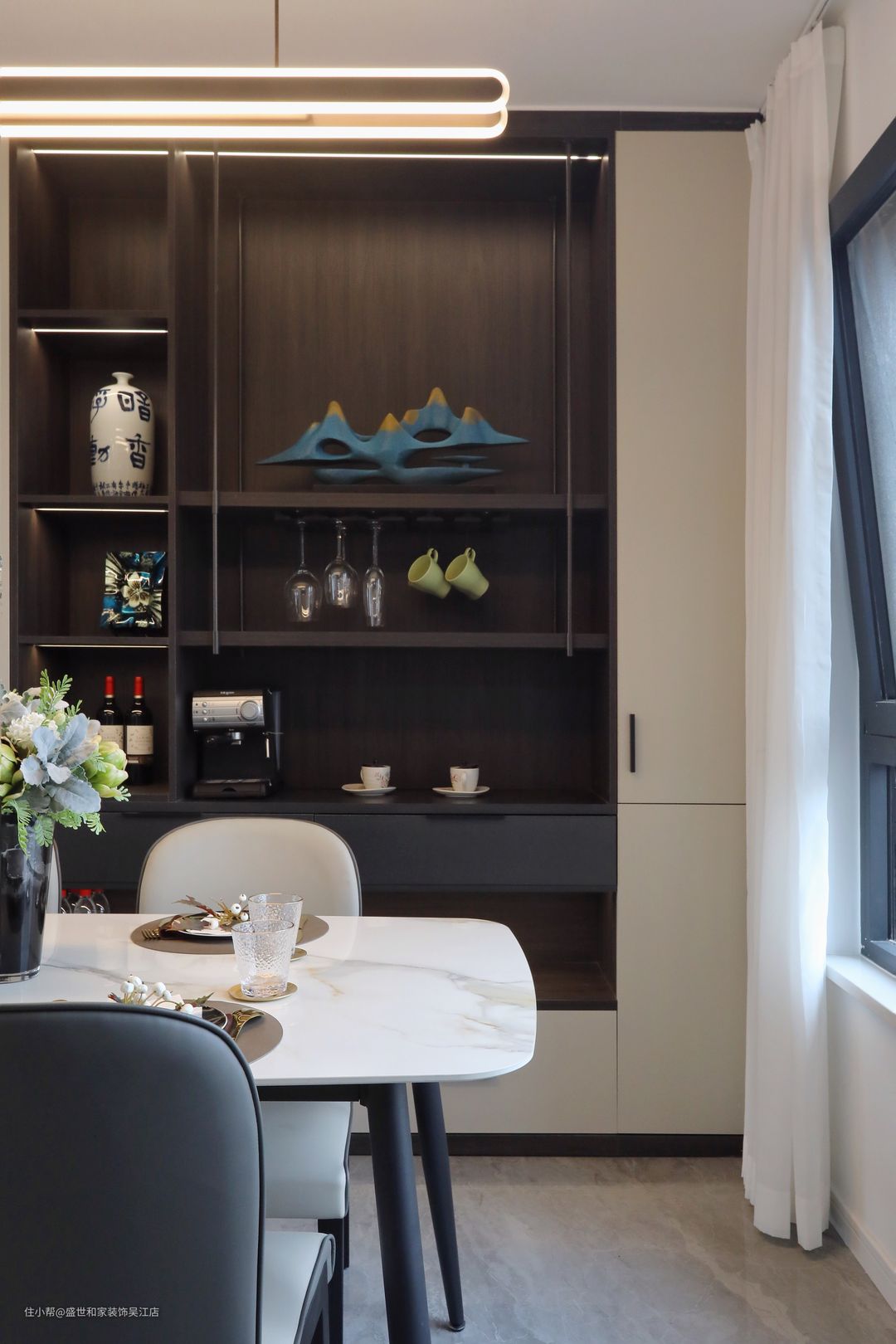 与厨房相对的餐桌另一边,做了整面的收纳柜,一做收纳,二做酒柜,三做展示。
